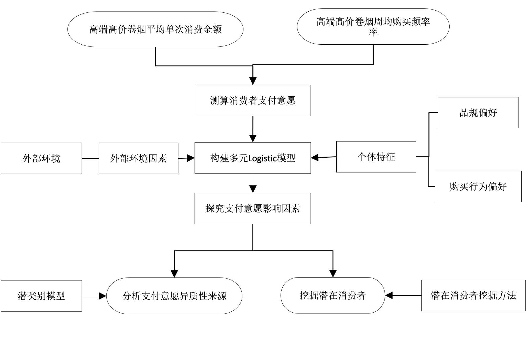 消费者行为学认为,消费者选择行为会受到两类因素的影响,一类是消费者的个体特征,如性格、习惯和爱好等,另一类是产品或服务的内外部环境因素,包括产品价格、服务质量和社会环境等[3] [4]。本文认为,消费者对高端高价卷烟支付意愿是产生支付行为的前提,而其对高端高价卷烟的支付意愿同时受到上述两类因素的影响。因此,结合相关理论和文献,本文通过构建模型,分析影响消费者对高端高价卷烟支付意愿的主要因素,并进一步探究产生不同程度支付意愿的异质性原因,最后以此为基础,挖掘潜在消费者人群。理论框架见图1所示。