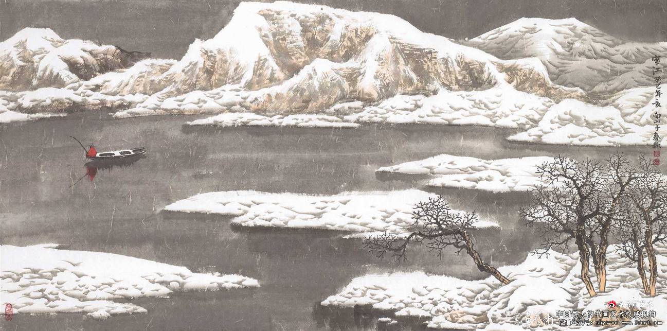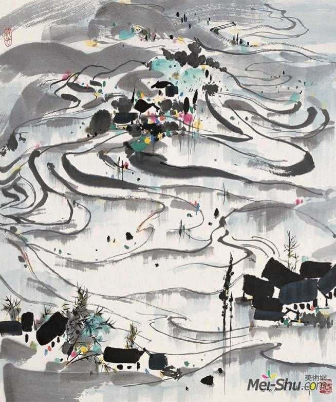 如吴冠中作品将传统山水画与现代绘画技法相结合,形成了独特的“水墨画现代化”风格。他的山水画作品在构图上简洁明快,色彩运用上大胆鲜艳,给人耳目一新的感觉(图1,图2)。赵春秋在传统山水画的基础上进行了大胆的创新,独创了雪地皴法等技法。他的作品在构图上打破了传统山水画的束缚,自由地安排画面元素;在色彩运用上借鉴了西方绘画的色彩理论,使色彩成为表达情感和营造氛围的重要手段(图3)。乐震文与张弛的作品以俯视为基本观察角度,擅长利用长焦镜及遮幅式镜头所形成的宽广画面感,以适应其超宽巨幅所营建的全景式山水(图4)。他们的山水画作品在技法笔墨上进行了创新,运用装饰感和平面感方式使画面的空间感有了新突破。同时,他们在用色上也成就了自己独有的技法,将大红、金黄、湛蓝、青绿等多种色阶与色系挥洒泼洒烘染于画中。
