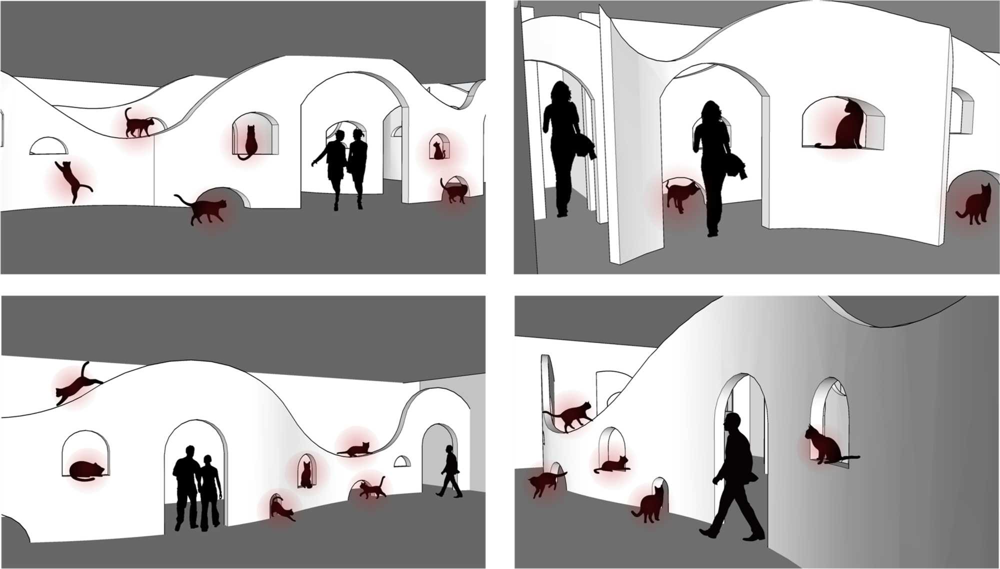 通过对宠物猫的行为分析,打造符合猫习性的空间设计形式。将人们的娱乐需求与猫的行为特点结合,为消费者提供独特的体验,营造轻松的氛围。探析人猫和谐共处的要素,增加人与猫互动交流。将人与宠物之间的关系进行深入的探讨和理解。