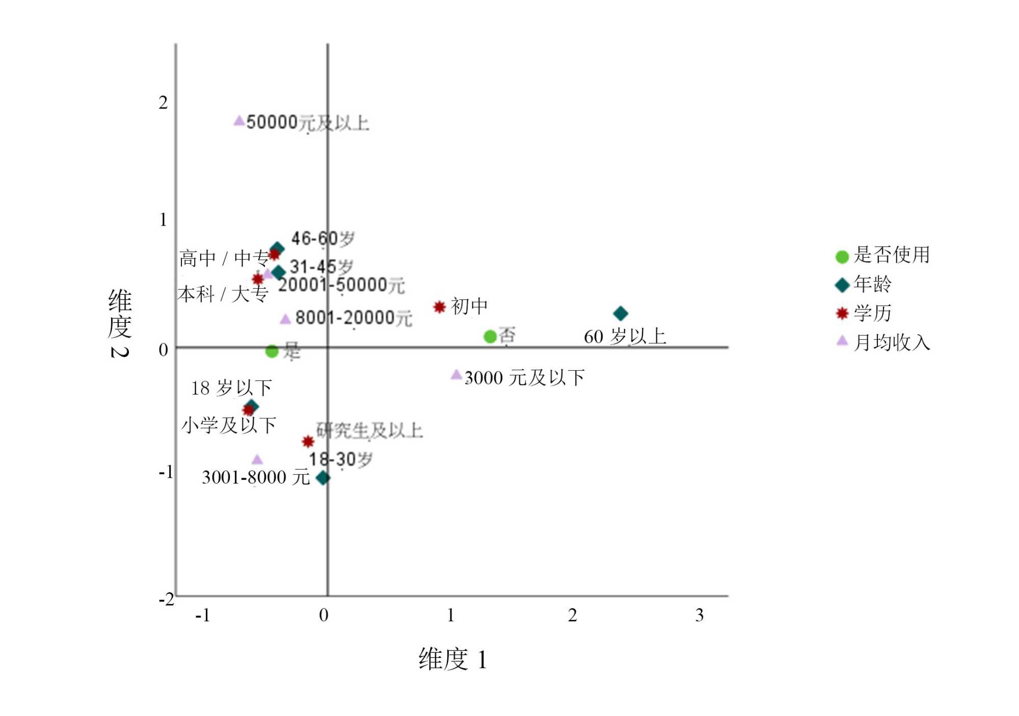 运用多重对应分析方法探究产品使用人群背景信息,结果如下图2所示,曾经或现在正使用产品的消费者年龄大多在60岁以下,学历主要集中在本科、大专、高中、中专,月均收入在8000~50,000元之间;未使用过的消费者年龄主要集中于60岁以上、学历较低且月收入在3000元以下。由此发现,产品受众度广,且学历、收入相对较高。