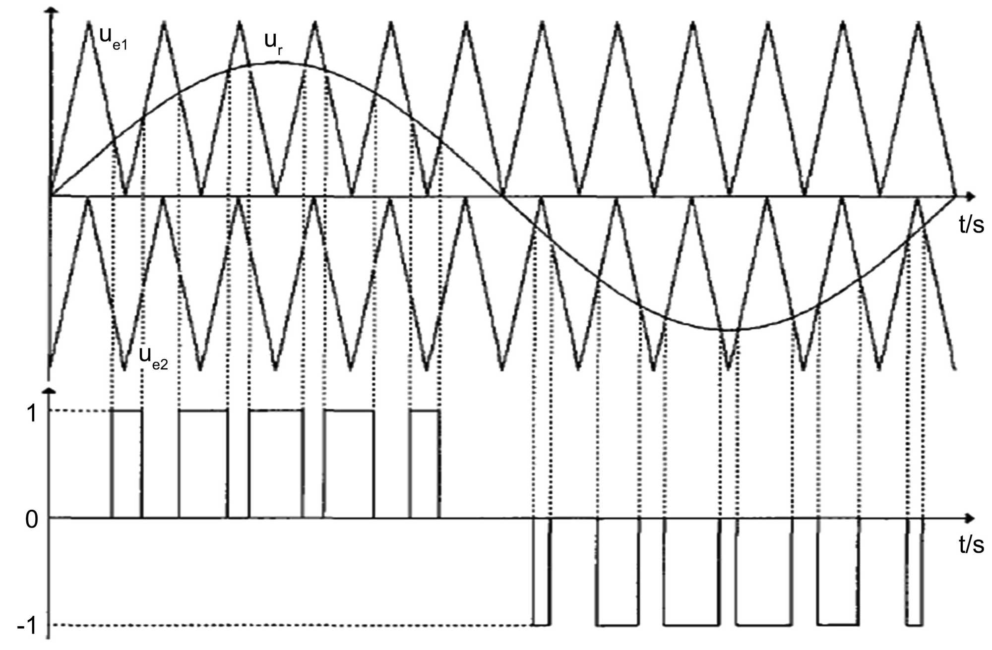 如图2为正弦波与三角波通过比较器产生PWM脉冲的示意图,这种通过正弦波与三角波的比较产生PWM脉冲的原理,利用了正弦波的周期性变化和三角波的固定频率以及线性变化特征,经过比较器的比较得到一系列宽度不同的脉冲,从而实现对输出信号的脉宽调制。脉冲信号连接开关管的方式如下:P1信号接往S1,P1信号反相后接S3 (S1和S3始终是反相位关系),P2信号接往S2,P2信号反相后接S4 (S2和S4始终是反相位关系)。正半周波时,S4始终关断,正半周波输出时,两个开关管S1和S2均为通态,两个开关管S3和S4均为断态,输出电压为Udc/2;负半周波时,S1始终关断,负半周波输出时,两个开关管S3和S4均为通态,两个开关管S1和S2均为断态,输出电压为−Udc/2;其余情况下,两个开关管S2和S3均为通态,两个开关管S1和S4均为断态,输出电压为0。