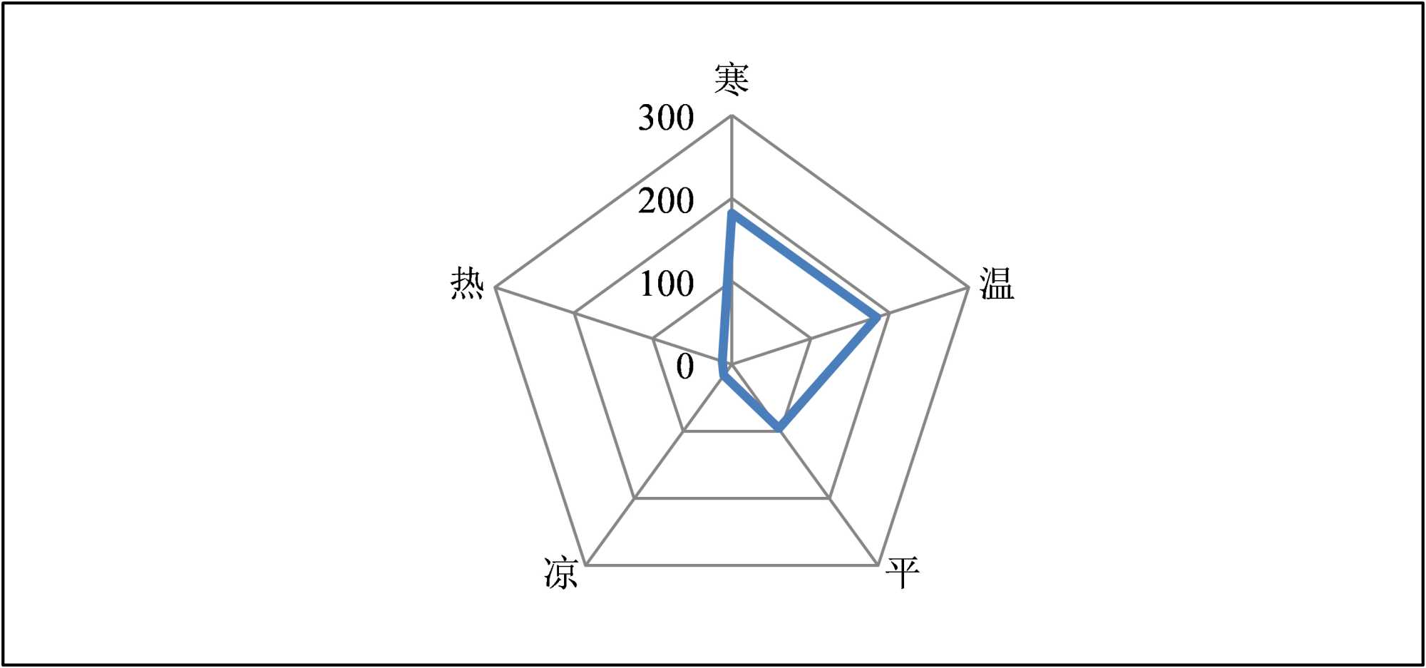 上述结果显示,治疗本病药物多以寒性(234次)为主,温性(144次)、平性(70次)次之。提示治疗过程中,除考虑患者病情虚实外,还当根据“寒者热之,热者寒之”的原则,分清寒热,分证论治。