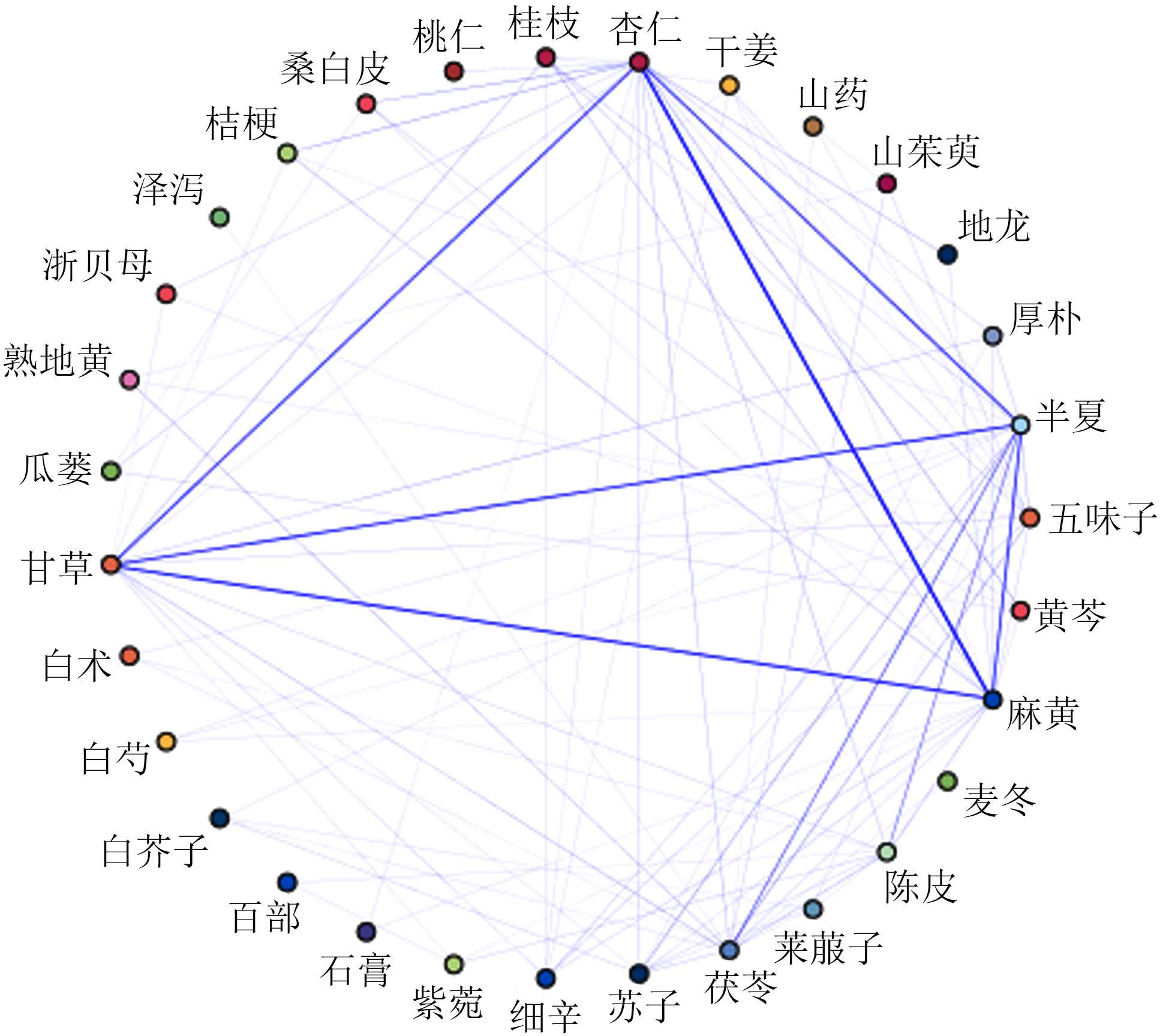 Figure 4. The network diagram of medicinal association rules used in TCM for the treatment of chronic bronchitis and emphysema