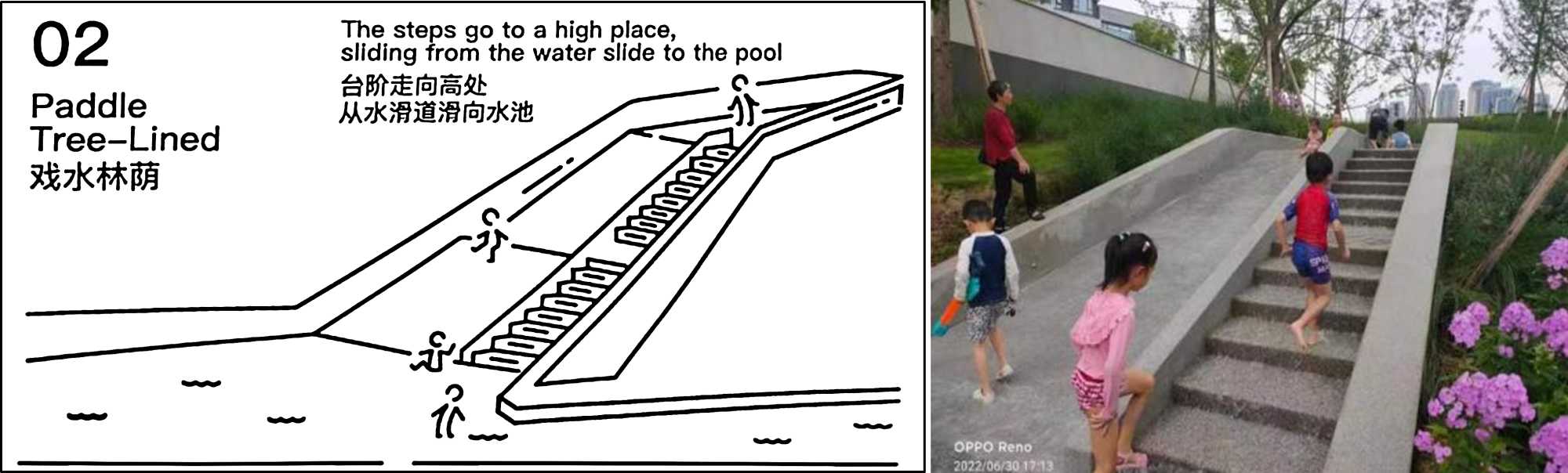 通过文献调查分析出水体景观对于儿童的互动、游戏与交流影响覆盖较广,因此在暑假期间对成都市水线公园进行实地观察,记录同一景观空间下的不同年龄阶段儿童的行为特征,同时分析出儿童的行为特点,总结出儿童偏好的空间类型。