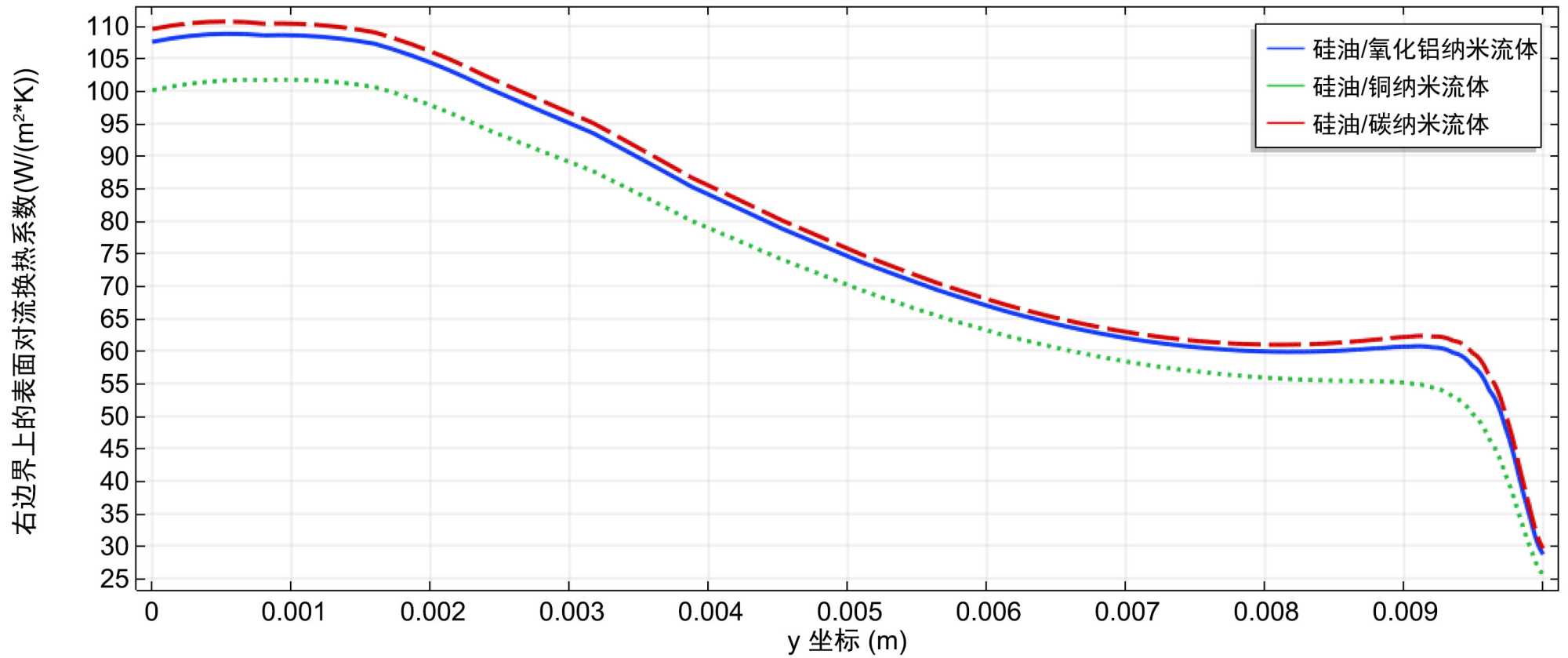 图16给出了不同材料下矩形腔内右边界表面x的分布情况,图上的水平轴代表二维矩形液层的y轴正方向,可见在右边界越靠近自由表面处对流换热系数越来越小,说明换热强度越小;对比三种不同材料,硅油/碳纳米流体的对流换热系数最大,依次是硅油/氧化铝纳米流体、硅油/铜纳米流体。表明在矩形腔的右边界处,硅油/碳纳米流体的换热效果最好,这与由温度分布得出的结论一致。同时,对比单相化处理之后纳米流体的物性参数,发现纳米流体的换热效果与流体的Marangoni数成正相关,即随着Marangoni数的增大,纳米流体的换热效果增强,这与之前学者的研究结论相符合。