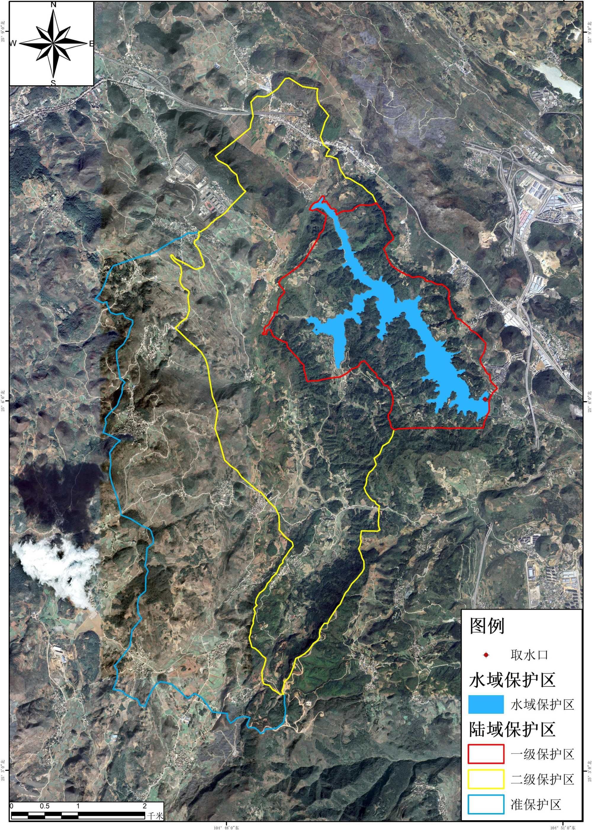 准保护区为水库流域范围,二级保护区、一级保护区以外的范围,按山脊线定界。保护区定界应充分利用具有永久性的明显标志,如分水线、行政区界线、公路、铁路、桥梁、大型建筑物、水库大坝、水工建筑物、河流岔口、航道、输电线等标识,结合水源地地形、地标、地物特点、原有保护标示牌的位置,初步确定各级保护区的地理界线,绘制现场定界图,再以现场定界图为依据进行现场勘查定界,确定各级保护区主要拐点的经纬度坐标,修改完善并最终确定保护区边界图和拐点坐标表。