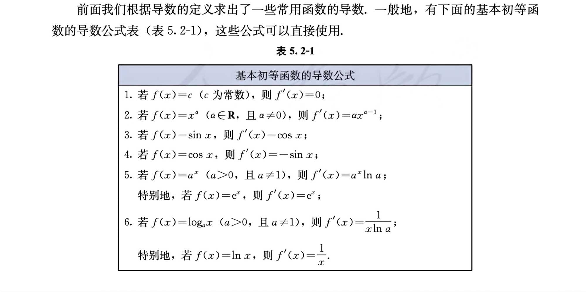 )的导数。在高中阶段,学生的认知有限,给出了几个函数的导数定义,体现了数学学习的逻辑性和严谨性,同时要遵从学生的认知规律,所以没有给出所有初等函数的求导过程,直接给出了导数公式,有利于学生自主学习、直观理解。数学教学原则中也提到严谨性与量力性相结合的原则,数学学习不能够过度形式化,也要考虑到学生的认知发展规律和心理发展规律,考虑到学生的经验,才能将数学知识转化为教育形态。