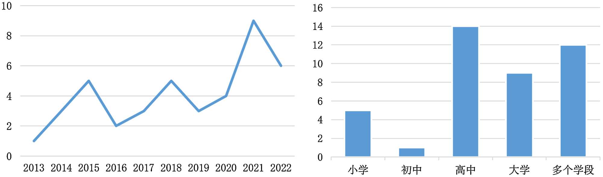 图2. 样本文献的年发文量(左)和各个学段的文献分布(右)