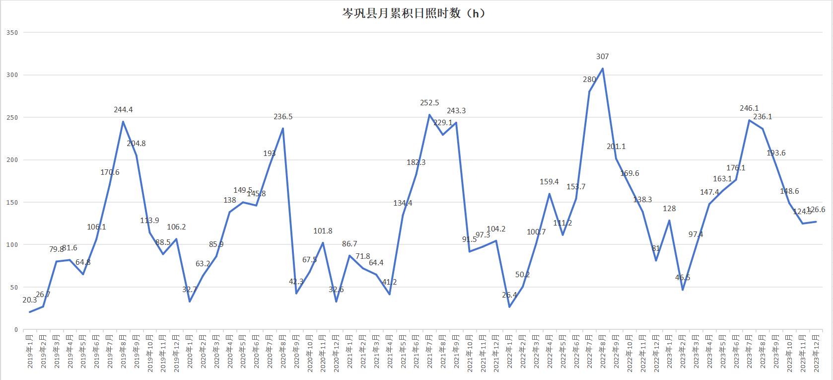 Figure 9. Monthly cumulative sunshine hours in Cengong County