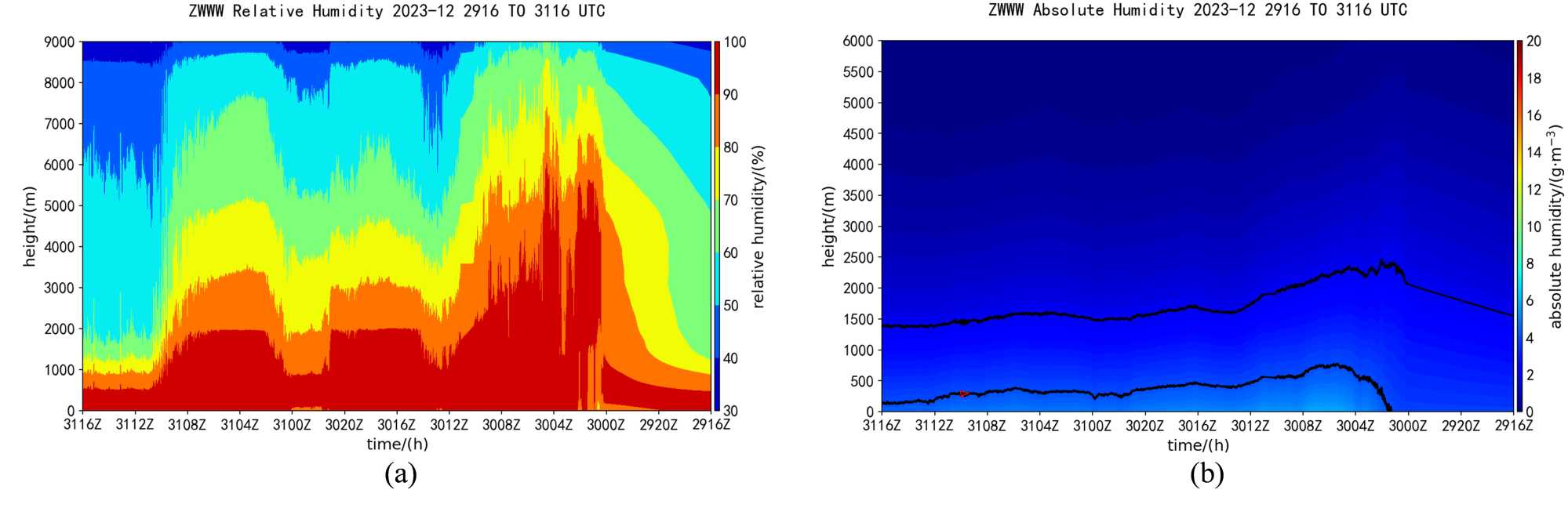 Figure 5. Humidity profiles of the microwave radiometer at Urumqi Airport: (a) relative humidity; (b) absolute humidity