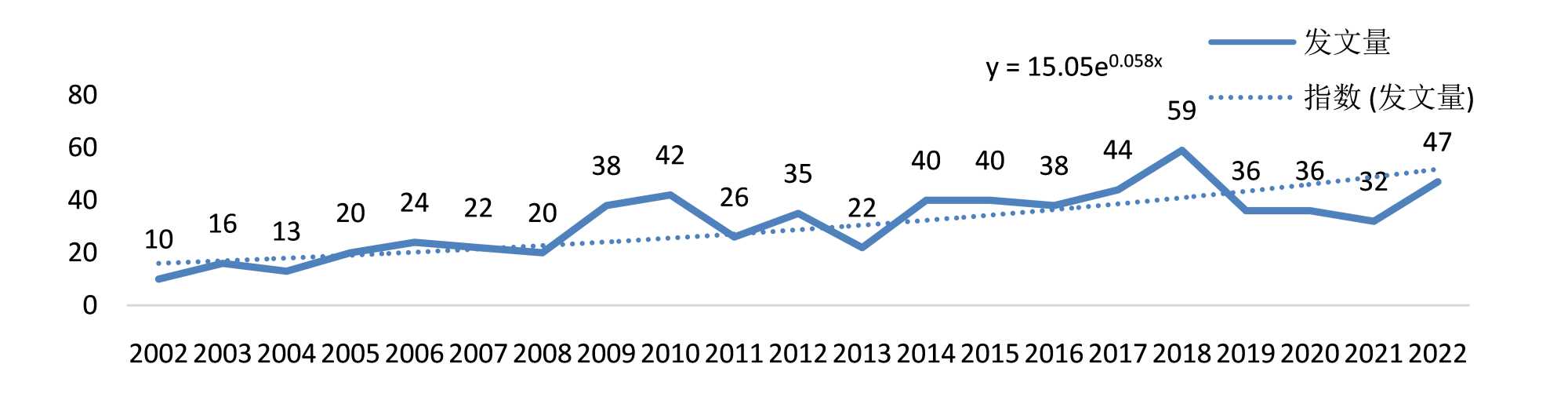 对纳入的660篇文献进行年度发文量统计,根据2002~2023年度发文量图发现(见图1),2002年至2023年间发文量如图1所示呈这样一个指数函数y = 15.059e0.0588x的增长趋势。年度最低发文量为10篇,年度最高发文量为59篇,年均发文量约31篇,其中,2009年和2014年发文量较上一年迅速增长,均增加18篇文献,为年间最大增长速度,考虑在2008~2009年“中医针灸”申报“人类非物质文化遗产代表作名录”和2013~2014年一次性使用无菌针灸针ISO标准颁布对针灸的相关研究的推动有重大促进
