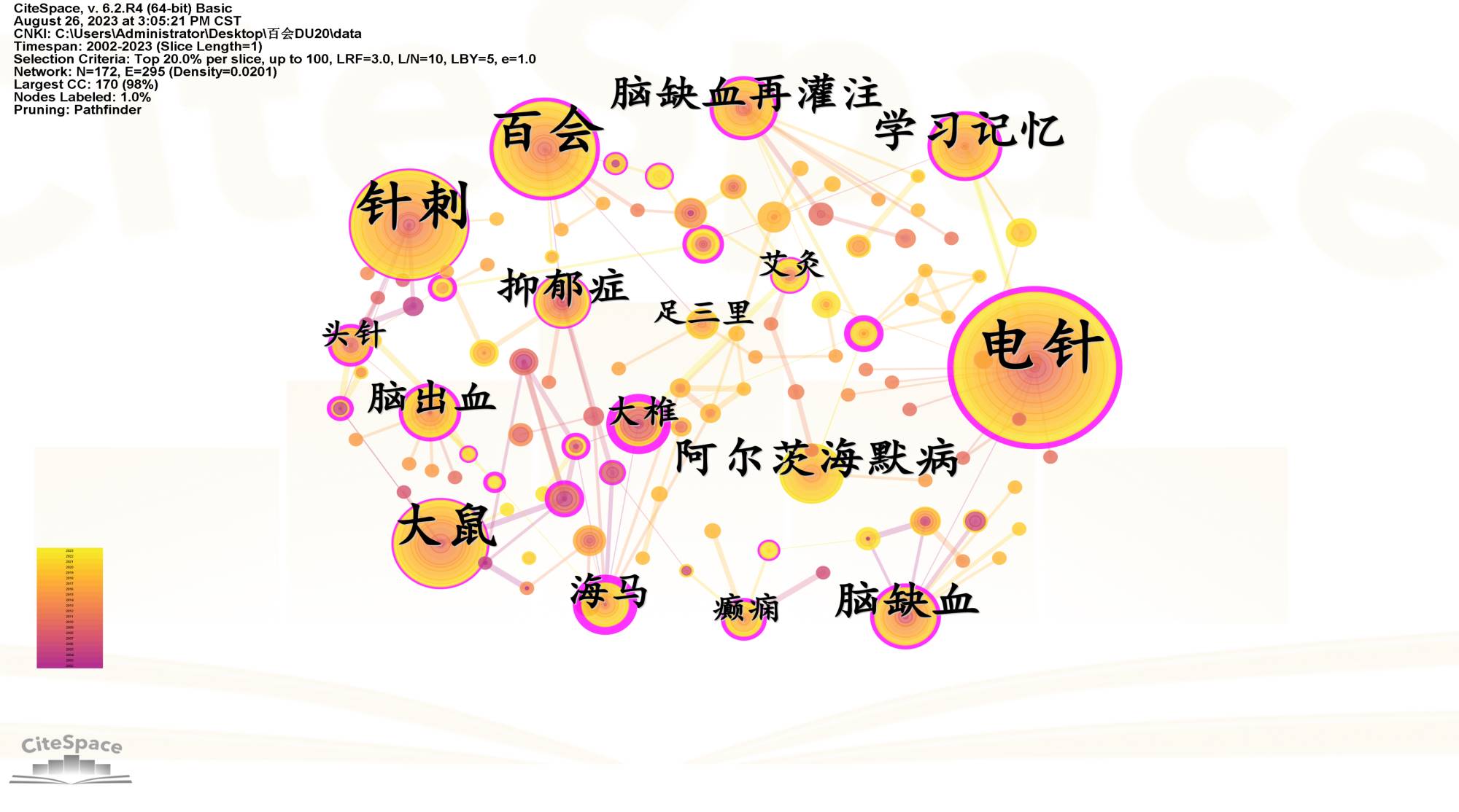 CiteSpace是一种科学知识图谱可视化工具,该软件基于共引分析和寻径网络算法等对数据样本进行可视化处理,展现特定知识领域内的演化过程。它可以可视化文献之间的关系,帮助我们了解该领域的研究轨迹、现状和热点话题,并揭示未来的发展方向。CiteSpace主要用于分析研究热点和趋势,也可以用于分析特定疾病或药物的研究情况,例如,哪些疾病或症状是目前研究的重点,哪些研究方法或技术正在被广泛使用等,而在针灸学领域,针灸治疗疾病的原理是通过对穴位的刺激而调节身体机能,现代研究尚未明确其相关机制,可能与针刺穴位后激活相关感觉传导通路与产生肽类物质等相关,许多学者通过动物实验阐释针灸的作用机制,但在穴位实验研究应用的总结类相关文章较少,其研究热点与研究趋势亟待挖掘。因此,本文以百会穴的基础研究为可视化对象,探讨百会穴在基础研究中的应用热点和趋势,并绘制知识图谱,为百会穴在基础研究中的应用提供新的视角和思路。