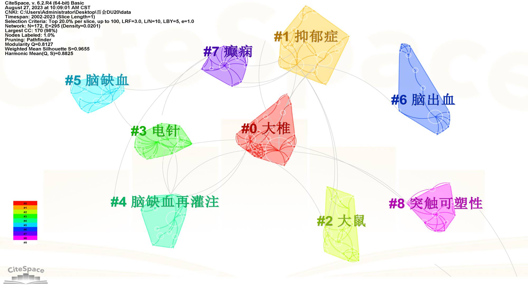 9个聚类依次是#0大椎、#1抑郁症、#2大鼠、#3电针、#4脑缺血再灌注、#5脑缺血、#6脑出血、#7癫痫、#8突触可塑性。其中,最大聚类大椎中,关键词为大椎、百会,提示大椎在基础实验的研究中与百会穴是搭配的重点与热点。其次是抑郁症聚类,关键词提示在抑郁症相关基础研究中,对海马体的研究是热点。其他的聚类提示大鼠为基础研究中的主要对象、电针主要应用于阿尔茨海默病和学习记忆能力的研究等。