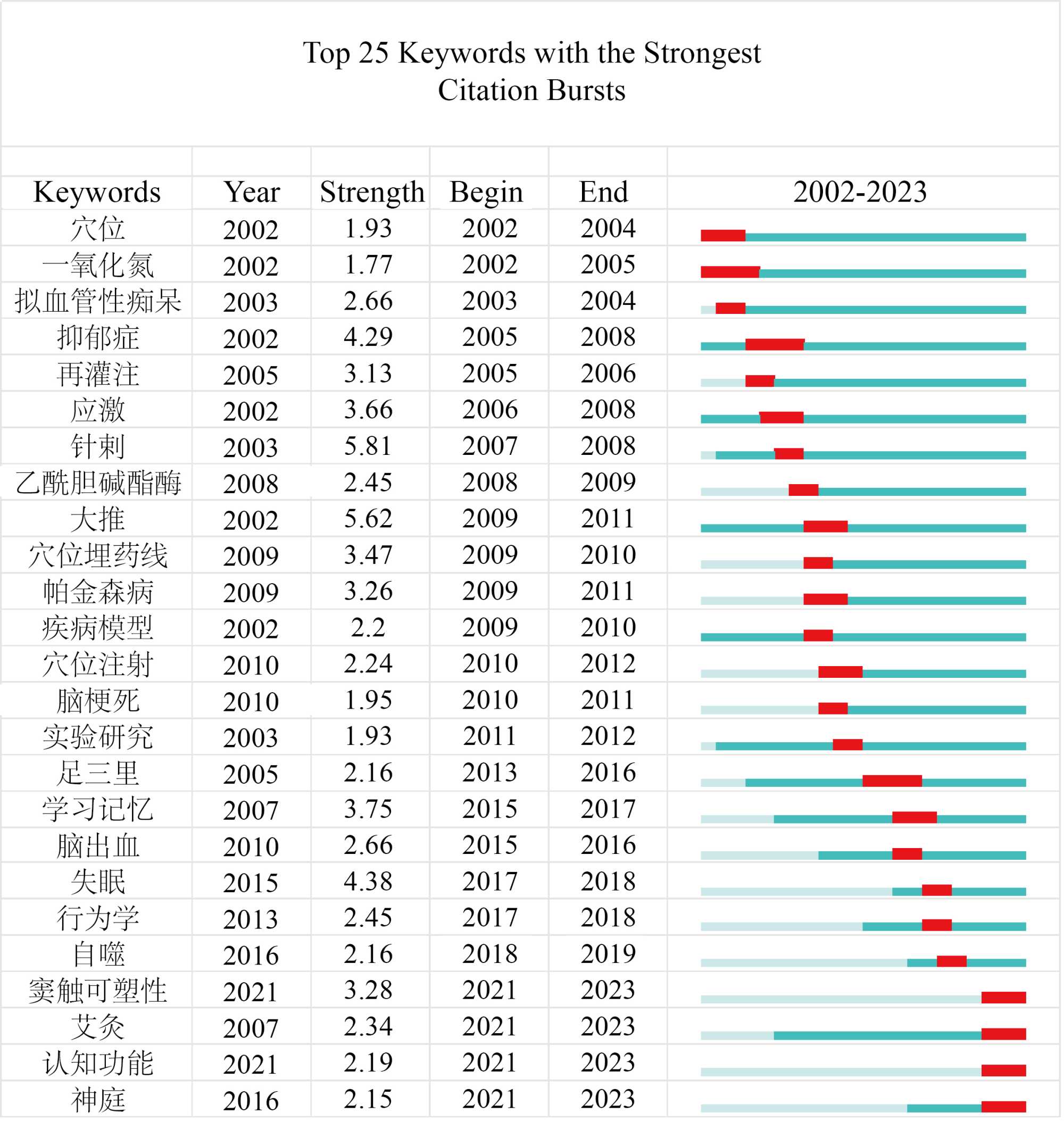 图4. 百会穴基础实验研究相关文献关键词突现图谱