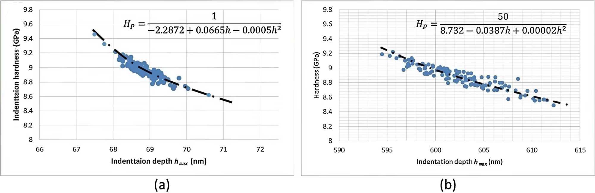 图6所示的比较结果显示,硬度与深度压痕尺寸效应曲线显示,不同载荷具有遵循多项式曲线的聚类特征,每个点之间的分布具有重叠效应。载荷为1 mN时,硬度分布的极值为1 GPa,载荷为50 mN时,硬度分布的极值为0.7 GPa,载荷增大时,硬度分布的离散程度减小。如前所述,硬度是基于接触面积的拟合过程计算得出的,其中多项式曲线适用于每种载荷的硬度分布趋势线,硬度值压痕深度的关系与图2所示负载控制的纳米压痕尺寸效应模型相符,表明所有值都在本次压痕尺寸效应研究的上下置信度范围内。