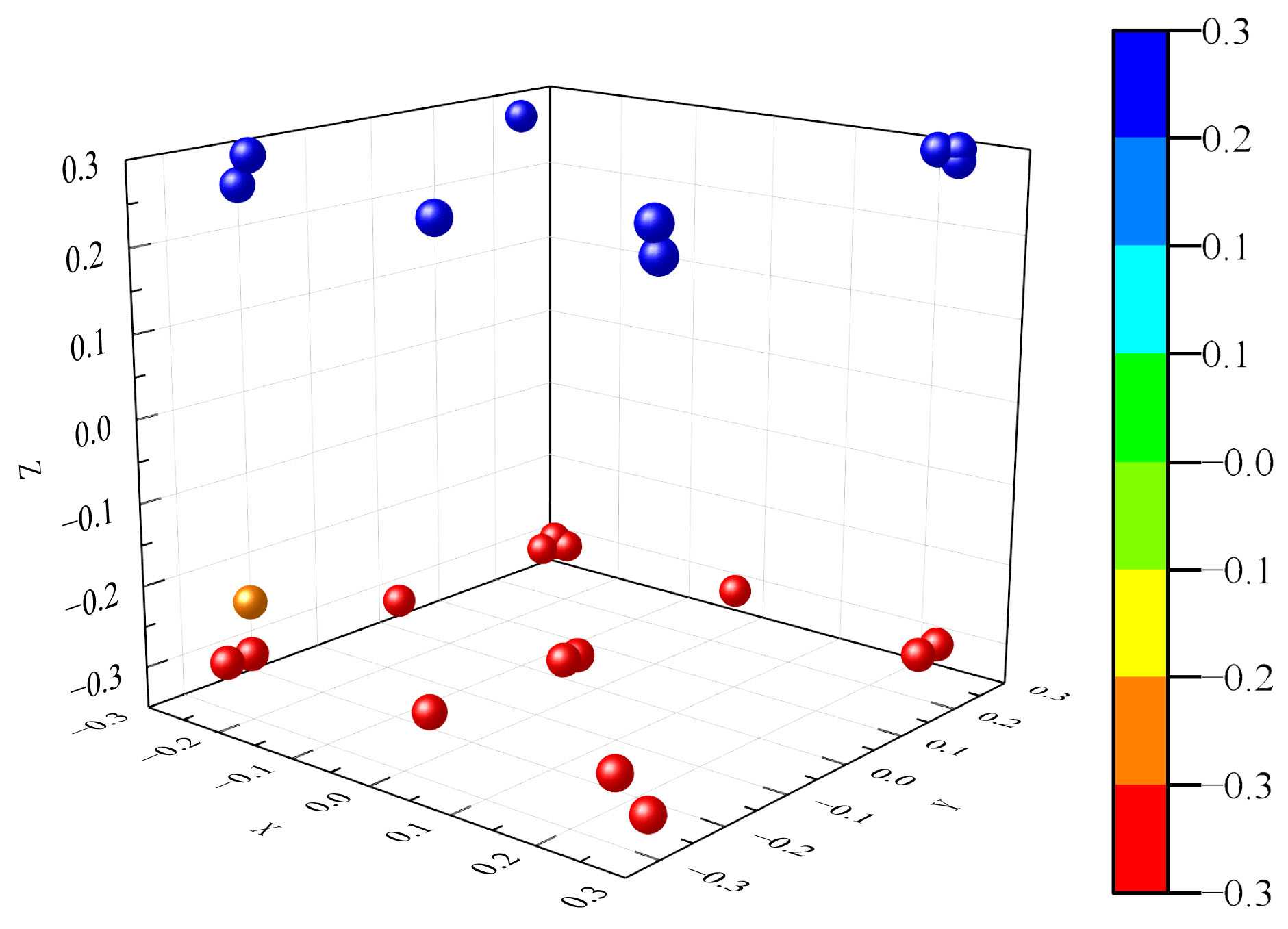 根据图11的结果显示,可以发现粒子群优化算法得到的位姿大多出现在并联机器人的工作空间边缘处。这表明选择一组边缘位置的位姿可以使结构参数误差辨识模型中的误差传递雅克比矩阵J具有较小的条件数,从而可以获得更高的辨识精度。