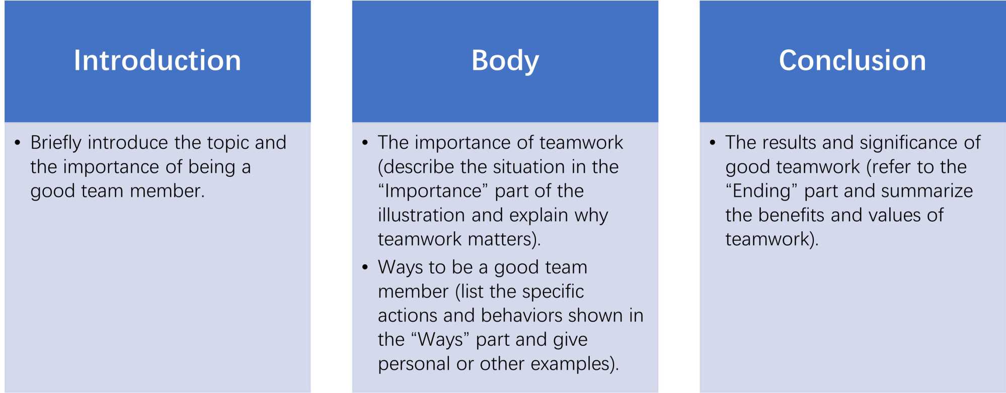 从题干中所呈现的插图来看,插图作为多模态语篇的关键组成部分,对于学生理解写作任务和构思文章起着重要作用。。题干中的插图分为Importance,Ways和Ending三个部分,通过人物形象和简单的动作展示了团队合作的重要性、方法和结果。在Importance部分,可能展示了个体与团队在解决问题或完成任务时的不同场景,如个体独自思考时的困惑画面和团队成员共同讨论时的积极氛围画面,通过对比突出团队合作能产生更多更好的想法,为学生阐述团队合作重要性提供直观依据。Ways部分的插图或许呈现了团队成员之间相互帮助、倾听、分工协作等具体行为,如有人帮忙搬重物、有人负责记录讨论内容等,这些画面为学生描述如何成为好的团队成员提供了具体的行为示例和思路,有助于学生将抽象的概念转化为具体的文字描述。Ending部分的插图可能描绘了团队成功完成任务后的喜悦场景,如成员们欢呼庆祝、获得荣誉等,使学生能够直观感受到团队合作带来的积极结果,从而在写作结尾部分更好地总结团队合作的价值和意义。整体来说,该插图具有简洁直观、信息明确的特点,但学生需要具备良好的“看”的技能,才能充分挖掘其中的细节和深层含义,为写作服务。