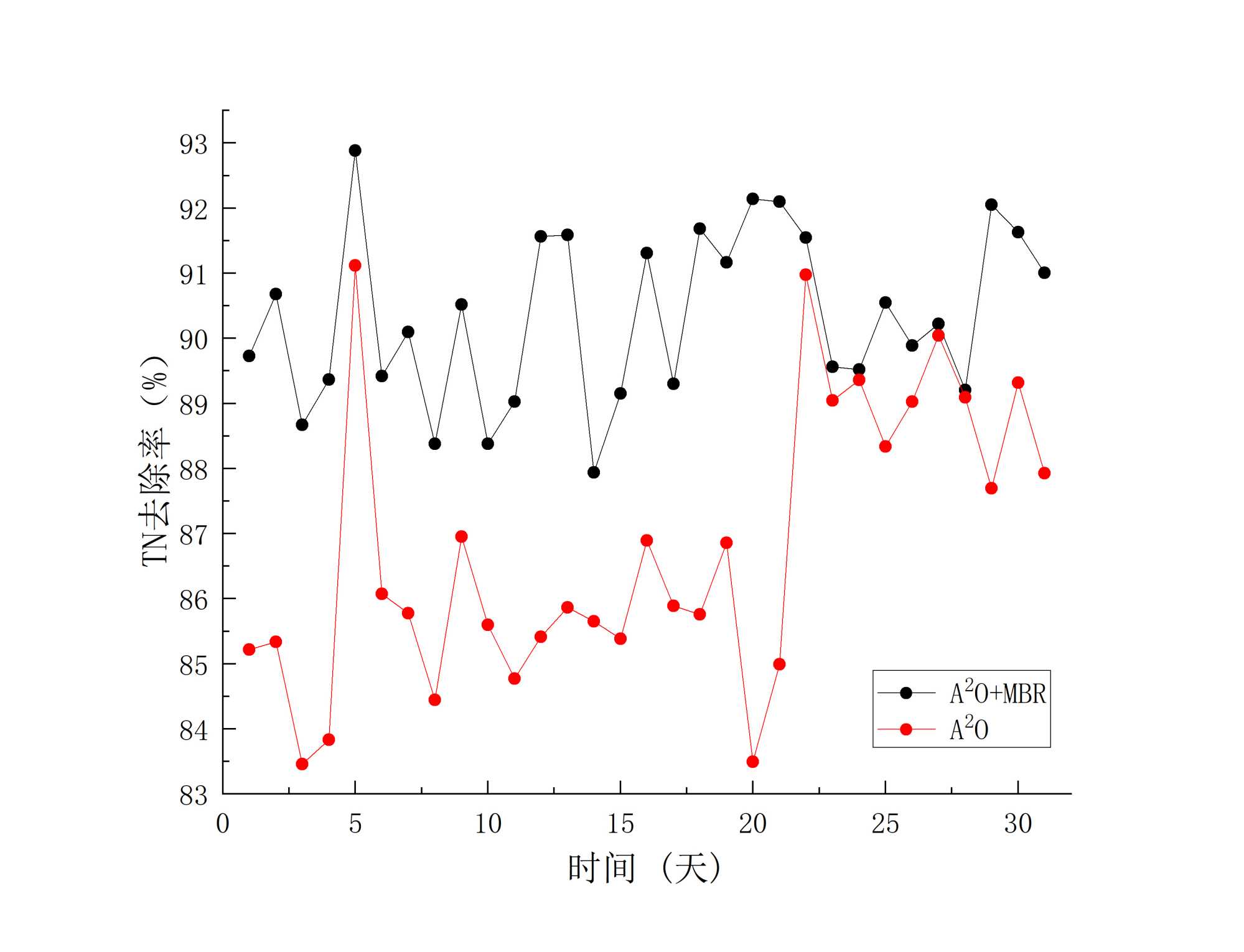 传统A2/O工艺对TN去除率均值为86.76%,A2/O + MBR工艺的去除率均值为90.33%。结果表明,在同季节、同时段、进水均匀分配的条件下,A2/O + MBR工艺对TN的去除效果优于传统A2/O工艺。这可能是由于MBR膜池中的高浓度MLSS带来的优势。同时,A2/O + MBR工艺采用膜区至好氧区首端、好氧区出水至缺氧区首端、缺氧区出水至厌氧区首端的三级回流方式。这种回流方式避免了污泥外回流中溶解氧过高而影响厌氧区释磷效果的问题,从而优化了脱氮除磷的过程。