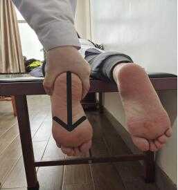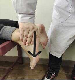 先予患者手法整复治疗,后使用固定带进行固定。具体操作:嘱患者俯卧位,双下肢伸直放松,医者手掌贴于患者跟骨后端,向后下方用力下压(如图1),当医者听及或触及关节弹响后,停止下压并立即使用固定带固定手法整复后的跟骨。固定带位置为足跟后方。治疗后予以足弓矫正器治疗。具体操作:测量该组所有患者足弓变形程度、足部生物力学改变程度、足部尺寸后,对其进行定制足弓矫正器并予以佩戴,使经手法整复后的跟骨得到进一步的精确矫正。嘱患者尽量适应初期佩戴时的不适感并坚持长期佩戴。