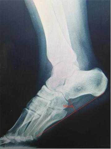 X线检查结果显示,3组患者治疗前的足弓均有不同程度的形变甚至消失,部分患者跖筋膜起点处已长出骨刺;治疗1年后3组患者的足弓均有不同程度的恢复,如图2。可见足弓高度增加4 mm,足弓功能得到恢复。
