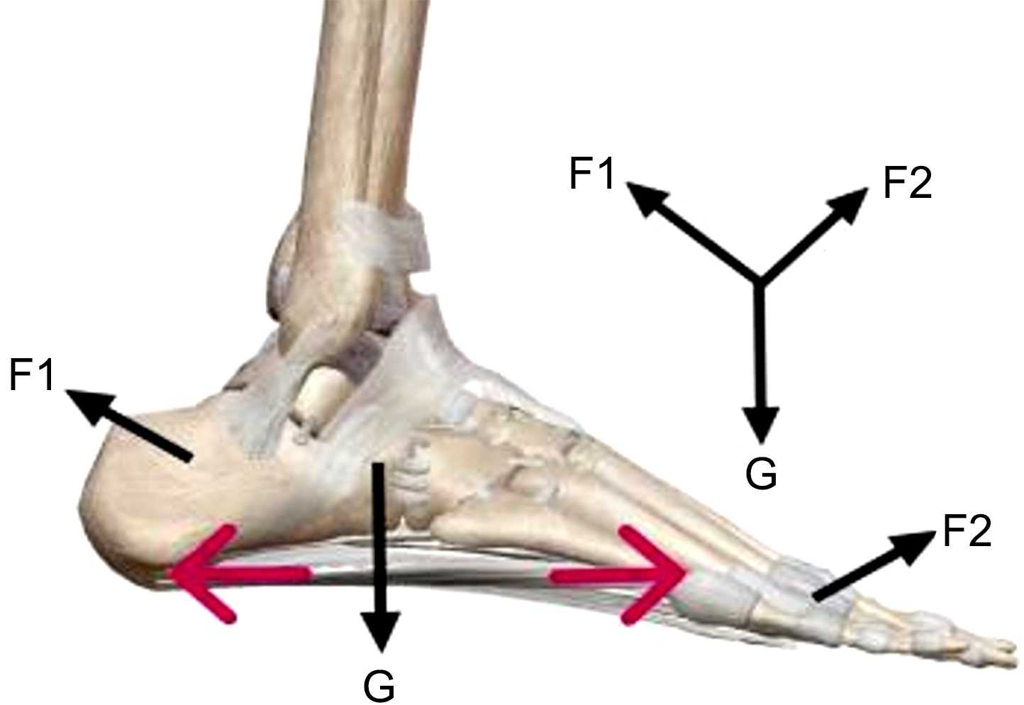 步行为人体最基本的运动方式,探究足部于行走支撑期生物力学特征对于深入研究跖筋膜炎的具体发病机制具有重要意义。根据足部各个部位与地面接触时间的先后顺序不同,可将行走支撑期分为初始着地、前掌触地、整足支撑和蹬伸离地4个阶段[9]。在人体的整个行走过程中,足部所受生物力学处于不断变化的阶段,从而导致患者足部的疼痛出现不断变化:患者于初始着地阶段,足弓开始受力,其弹性及刚性结构开始发挥缓冲作用,但由于人体重量尚未完全作用于足弓,跖筋膜未得到大幅度牵拉,所以此时患者不会出现或者仅出现轻微疼痛;进入前掌触地阶段后,足弓进一步受力,其发挥缓冲作用的同时,也开始发挥过渡作用,为下一阶段承受全身重量做准备,足部通过前两个阶段的受力来调整足部的姿态并使其稳定,协调自身足部的骨、骨骼肌和关节从而调整人体平衡,此时患者足弓因受力而使其弧度变小,跖筋膜进一步受到牵拉而出现疼痛;整足支撑阶段,人体重量完全作用于足部,足弓承受重量达到最大导致其发生形变、弧度减小,进而使得跖筋膜受到过度牵拉,并且由于地面对跟骨的反作用力,导致跟骨向后上方移位,使本就受到过度牵拉的跖筋膜进一步被牵拉,此时患者足跟部跖筋膜起点处出现剧烈疼痛(如图3);进入蹬伸离地阶段后,足跟抬起的瞬间,足弓变形及跟骨移位尚未恢复,且由于趾伸作用,跖筋膜被牵拉的程度达到最大,导致此时患者足部疼痛值达到最高。由于跖筋膜长期处于被反复牵拉的紧张状态,应力对骨膜的长期刺激,会使跖筋膜起点处的骨面被拉长甚至产生骨刺,而骨刺又会进一步加重足跟部的疼痛[10]。据跖筋膜炎的具体发病机制可知,患者的疼痛是由于跖筋膜受到牵拉,而导致跖筋膜受到牵拉的原因则是跟骨移位以及足弓变形,因此,跖筋膜炎的治疗,必须整复其移位的跟骨,恢复其形变的足弓,解除高应力纤维[11]。