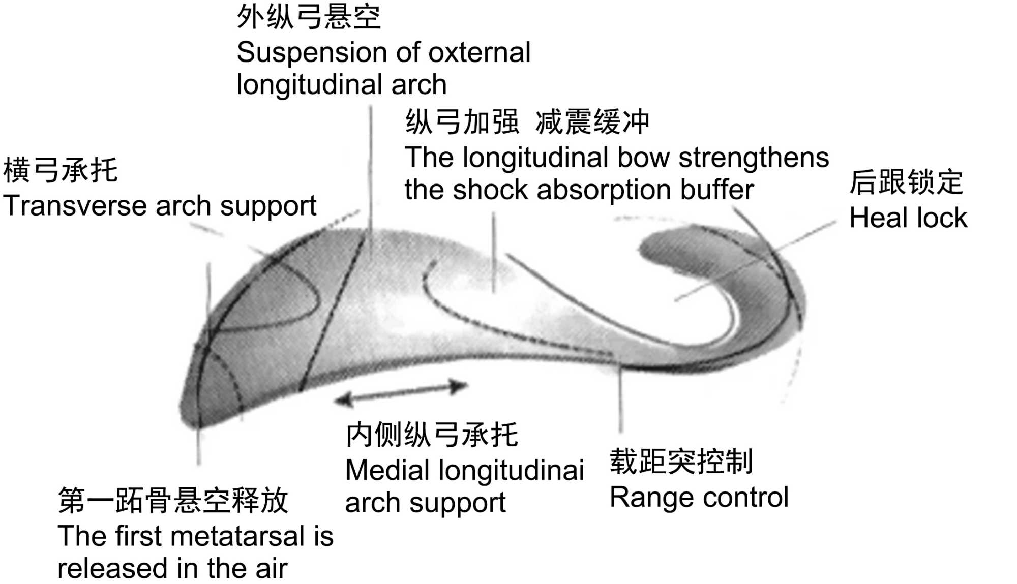 针刀联合手法加足弓矫正器,是先通过针刀治疗后,以手法整复复位其移位的跟骨,以足弓矫正器恢复其形变的足弓。所谓良丁不废外治,《医宗金鉴》载言:“夫手法者,谓以两手安置所伤之筋骨,使仍复于旧也”,乃“正骨之首务”,“盖一身之骨体,既非一致,而十二经筋之罗列序属,又各不同”,可见需注意个体的特殊性,注重理论与具体实践相结合,还体现了筋骨并重的理论[12]。因此,我科将该理论应用于跖筋膜炎时,在手法整复跟骨的过程中也注重跖筋膜的复位,二者的共同复位,能有效减轻跖筋膜所受的牵拉,从而减轻患者的疼痛。按照《医宗金鉴·正骨心法要旨》所总结的“正骨八法”和外固定器具的使用[13],对于跖筋膜炎的治疗,除了手法整复外,还需要外固定器具,以使中医理论与具体临床实际充分结合。为此,我科先使用固定带将整复后的跟骨进行固定,同时搭配足弓矫正器,不仅能够矫正形变的足弓,而且能对手法整复后的跟骨进行进一步的精确矫正。足弓与跟骨的共同矫正,可极大减轻跖筋膜所受的牵拉程度,从而显著缓解患者的疼痛[14]。此治疗方案既为患者的治疗提供了更好的方案,也为医者提供了更为有效、便捷的治疗选择。由于各自人体比例存在差异,因此足弓矫正器的量身定制尤为重要,可以使足弓矫正器与人体契合度更高,佩戴更加舒适[15],且无需担心压疮、骨筋膜室综合征、肢体僵硬等。足弓矫正器的工作原理,是通过锁定后跟并控制载距,使距下关节接近中立位;同时通过内、外侧纵弓及横弓的承托,增大足底受力面积、分散足部压力,继而借由特有材质的压缩和弹性,重新引导地面反作用力的吸收、缓冲与减震,为足部与身体之间寻回动态平衡的理想状态(如图4)。其材质为高品质碳纤维复合生物材料,强度优越,结实耐用,可支持患者长期佩戴。针刀联合手法加足弓矫正器的治疗方案,与手术相比较,具有以下优势:1. 操作便捷迅速,无需住院,无石膏固定,无手术恢复期。2. 减轻患者对治疗的恐惧,使大多数患者都易于接受。3. 消除手术治疗给患者身体带来的损伤。统计结果显示,1年后联合治疗组的复发率为12.50% (5/40),远低于针刀治疗组的37.50% (15/40)和手法加足弓矫正器组的40.00% (16/40)。可见,针刀联合手法加足弓矫正器,为跖筋膜炎提供了一个可行的治疗方案。