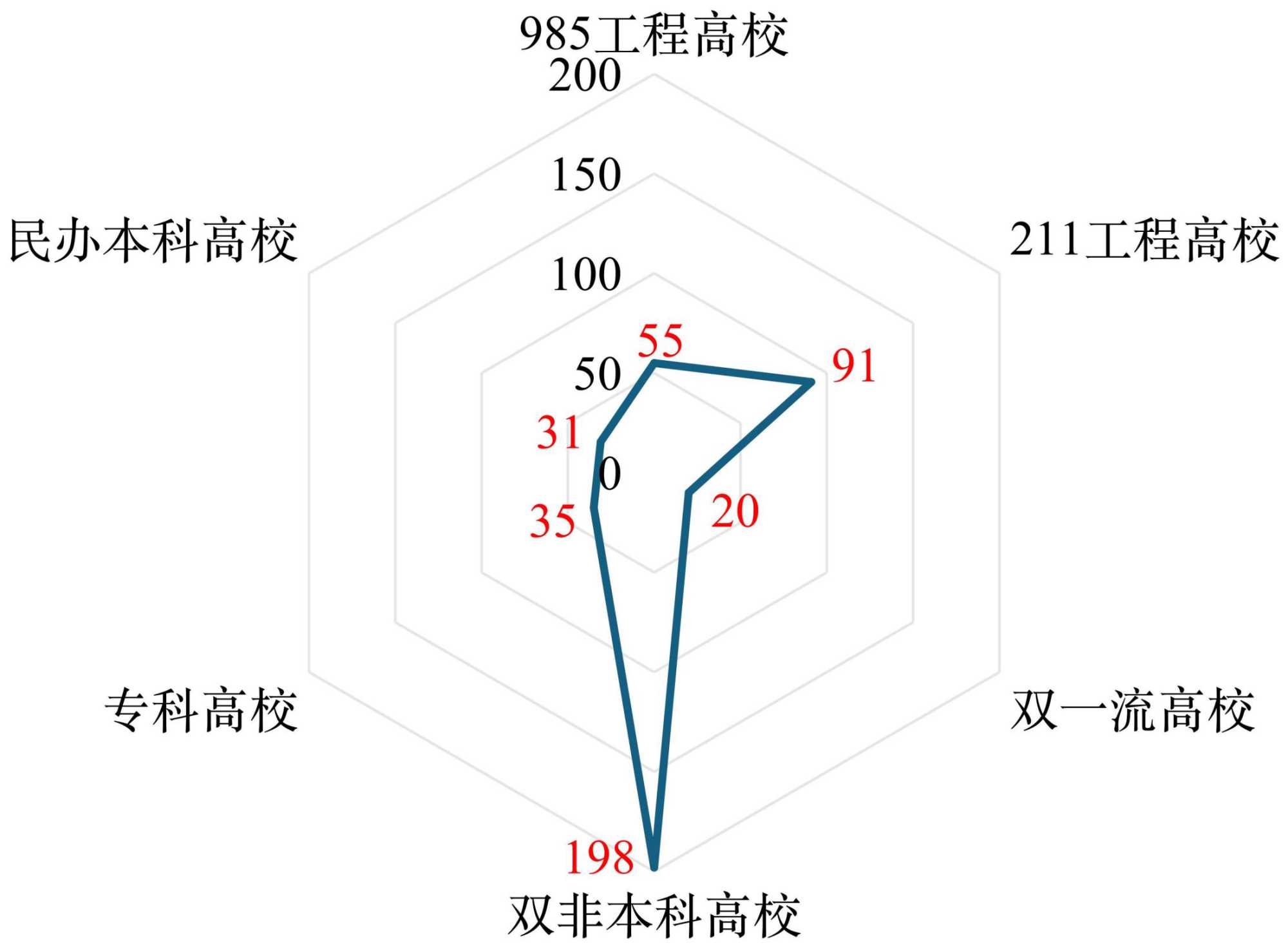 “985工程”指的是1998年启动,支持39所高校结合国家创新体系进行重点建设的工程(以下简称985高校)。“211工程”指的是1993年启动,先后共有112所高校纳入建设范围,全部高校均属全国普通高等学校(以下简称211高校)。现已将“211工程”和“985工程”等重点建设项目统筹为“双一流”建设(以下简称双一流院校)。而双非既为进入上述建设工程项目的高等院校(以下简称双非本科)从图3可知,对高校学生组织进行研究的作者,有46.05% (198/430)来自双非本科,有21.16% (91/430)来自211高校,有12.79% (55/430)来自985高校,有4.65% (20/430)来自双一流院校,有8.14% (35/430)来自专科院校,还有7.21% (31/430)来自民办学校。由此可知,在当前对高校学生组织研究最多的作者大多数来自双非本科高校的,其次则是来自211或985院校。可见,当前较高层级的高校对高校学生组织的研究相对更加重视,更加关注高校学生组织在高校建设发展中的作用。除此之外,双非本科的作者在此表占据最多数,也从侧面反映出当前大多数学者对高校学生组织进行研究,可能只是用于晋升等途径,而非是对其进行深入研究,深挖高校学生组织在高校发展中的作用。