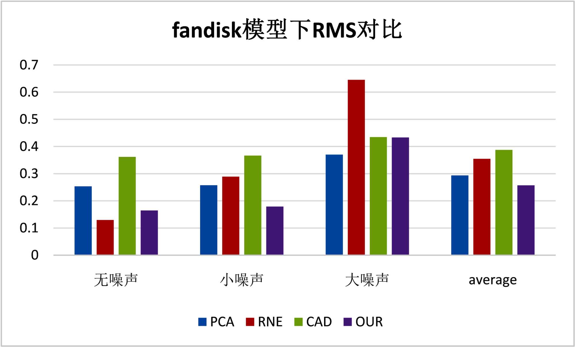 对于均方根误差RMSE,其数值越小,反映通过该算法进行法向估计得到的法向越接近于真实法向,通过该算法计算得到的法向越准确。
