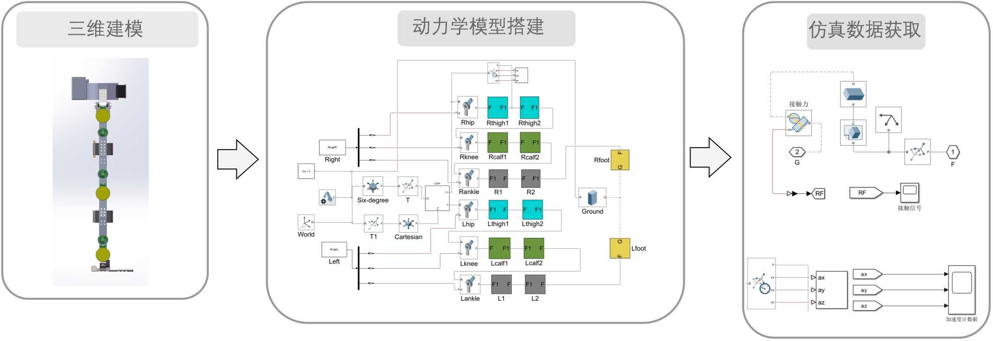 为获取所需步态数据,本文首先使用Solidworks建立下肢外骨骼机器人三维模型,而后将其导入Matlab/Simulink平台并搭建下肢外骨骼机器人动力学模型,该动力学模型由左右腿髋、膝、踝关节连接相关零件,通过设置各关节连接方式为转动连接并输入各关节转动角度进行数据驱动,仿真数据收集流程如图1所示,其中加速度传感器以腰部为基准,对大腿角加速度进行数据采集以模拟WISDM数据集中数据收集过程。此外,对足底添加接触传感器,实时反馈足底接触信息。在仿真过程中将上述传感器数据可视化,并将其储存于Matlab工作区中以便于后续数据处理。