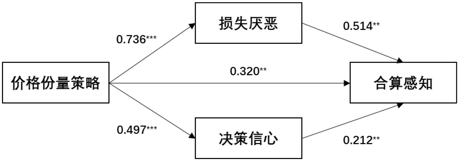 1) 样本描述性统计。实验二共收集问卷100份,剔除回答时间过短(少于2分钟)、重复选项过多(连续超过4项)、未正确回答陷阱题(此题请选5)的问卷后,共获有效问卷92份(回收率92%),其中价格未满组44份、份量溢出组48份,男性43人,女性49人,年龄绝大部分在18至25岁,大部分月平均可支配收入在2501至8000元。2) 控制变量对消费者合算感知均无显著影响(p > 0.05)。3) 信度和效度分析。合算感知、损失厌恶和决策信心量表的Cronbach’s α值分别为0.874、0.748和0.915;Bartlett球性检验的p值均小于0.001,KMO值分别等于0.83、0.74和0.85。4) 中介效应检验。① 首先,检验价格份量策略对消费者损失厌恶和决策信心的影响,分别以损失厌恶和决策信心为因变量,以价格份量策略为自变量(设价格未满策略为1,份量溢出策略为0),独立样本T检验结果表明,价格份量策略对消费者损失厌恶的影响存在显著差异(F(1, 90) = 10.52, p < 0.001),相比份量溢出策略,消费者对使用了价格未满策略的产品的损失厌恶更高(M价格未满 = 6.00, SD = 0.15; M份量溢出 = 5.33, SD = 0.15; F(1, 90) = 10.451, p < 0.001),支持假设H2。同时,价格份量策略对消费者决策信心的影响存在显著差异(F(1, 90) = 7.71, p = 0.001 < 0.05),相比价格未满策略,消费者对使用了份量溢出策略的产品的决策信心更高(M价格未满 = 5.22, SD = 0.14; M份量溢出 = 5.81, SD = 0.13; F(1, 90) = 12.38, p < 0.001),支持假设H4。② 其次,通过回归分析检验损失厌恶和决策信心对消费者合算感知的影响。构建以损失厌恶和决策信心为自变量,合算感知为因变量的回归模型。损失厌恶的标准化回归系数为β = 0.664 (t = 11.163, p < 0.01),表明损失厌恶对消费者的合算感知有显著的正向影响,支持假设H3前半部分。决策信心的标准化回归系数β = 0.511 (t = 7.464, p < 0.01),表明决策信心对消费者的合算感知有显著的正向影响,支持假设H5前半部分。③ 最后,使用SPSS 27.0软件中的PROCESS 4.1插件,检验损失厌恶和决策信心的共同中介效应。检验方法参照Bootstrap方法[24],检验模型选择Model 4,样本量选择5000,控制变量为个人信息,置信区间设为95%,取样方法选择偏差校正的非参数百分位法。结果显示,两个中介变量的共同中介作用显著(LLCI = 0.223,ULCI = 0.676,不包含0),作用大小为0.483。其中,损失厌恶(LLCI = 0.154, ULCI = 0.603)和决策信心(LLCI = 0.101, ULCI = 0.586)都发挥了显著的正向中介作用,置信区间均不包含0,中介效应值分别为0.378和0.105。在控制共同中介效应后,价格份量策略对消费者合算感知的直接影响仍显著(LLCI = 0.089,ULCI = 0.495,不包含0),直接效应值为0.32,说明损失厌恶和决策信心均发挥部分中介作用,且相比决策信心,损失厌恶发挥了更强的中介作用。双中介路径分析结果的可视化(见图5)也表明,损失厌恶和决策信心在价格份量策略对消费者合算感知的影响中起共同中介作用,且损失厌恶的效应值大于决策信心的效应值,发挥更强的中介作用。至此,检验结果支持假设H3和H5。