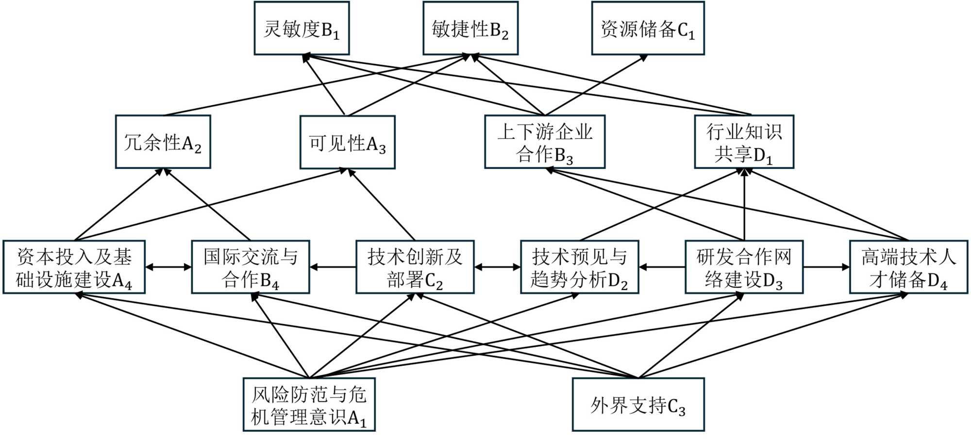 由图1可知,影响半导体供应链弹性的因素可分为四个层级。往下各个层级为上一层级的原因,往上的层级为下一层级的结果。由此可见,底层的风险防范和危机管理意识A1及外界支持C3是影响半导体供应链弹性的最根本影响因素,对所有其他因素都有直接或间接的影响,具有最高驱动力。第二、三层级的因素包括资本投入及基础设施建设A4、国际交流与合作B4、技术创新及部署C2、技术预见与分析D2、研发合作网络建设D3、高端技术人才储备D4以及冗余性A2、可见性A3、上下游企业合作B3、行业知识共享D1。它们是系统中的中介和次要因素,均依赖于所处位置的上一层影响因素,而又对下一层因素产生影响。第四层影响因素包括灵敏度B1、敏捷性B2、资源储备C1。它们作为系统的响应因素更多地受其他因素的影响,对其他大部分因素几乎没有影响。