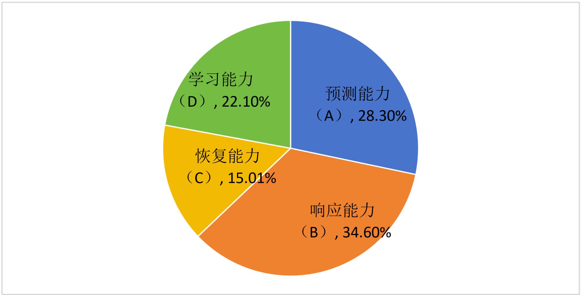 如图2所示,在一级指标层面,重要性由高到低分别为响应能力、预测能力、学习能力以及恢复能力。响应能力的核心在于其即时性,当面对市场波动、客户需求变化、自然灾害、政治动荡等风险和挑战时,企业需要在第一时间做出响应,而这种快速响应能力有助于减少因延误或中断导致的损失,并帮助企业最大程度上保持其供应链的连续性和稳定性。因此,响应能力权重排序最高,企业应给予高度重视。紧接着,预测能力的权重占比位居第二。较强的预测能力能够帮助企业减少不确定性并帮助企业提前准备和预防可能的供应链中断,因而提前识别潜在风险和趋势的能力也十分重要。此外,学习能力涉及到企业的供应链在经历挑战后能否吸取教训并进行改进。这种能力不仅体现在企业对过往经验的总结上,更在于能否将这些经验转化为未来应对类似挑战的策略与行动上。所以对于企业而言,培养和强化学习能力是实现供应链长期稳定和弹性提升的关键因素之一。最后,恢复能力确保了企业在面对供应链中断或灾难事件时能够尽快恢复正常运营、减少损失。然而,在遭遇重大危机后,企业供应链整体的恢复通常耗时较长,且危机发生后的影响已经产生,因此相对于其他能力,其优先级稍低。即便如此,企业也应给予一定的重视。