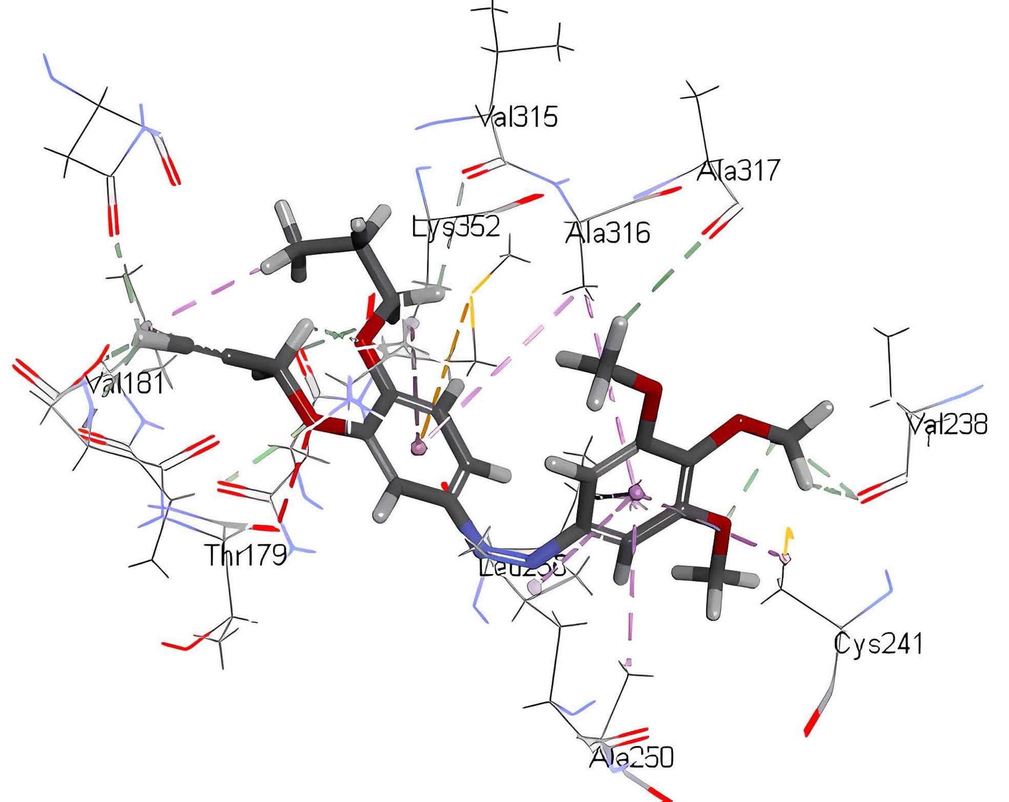 Azo-Pr打分最佳的构象与蛋白的相互作用显示,最优构象中的两个苯环中,A环与微管蛋白的Cys241、Leu248、Ala250、Ala316等残基形成非键相互作用,与cis-CA4非常一致;但B环则与Ala316、Lys352残基形成非键相互作用,由于引入的丙炔是直线型,引起蛋白残基变化,与Thr179形成了氢键作用,使其结合能量大大降低(图4)。Azo-Bu的情况也类似(图5),但它的B环分别与Leu258、Ala316、Lys352残基形成非键相互作用,炔基与Ly2352、Thr179形成非键相互作用,共同稳定了结合构型。
