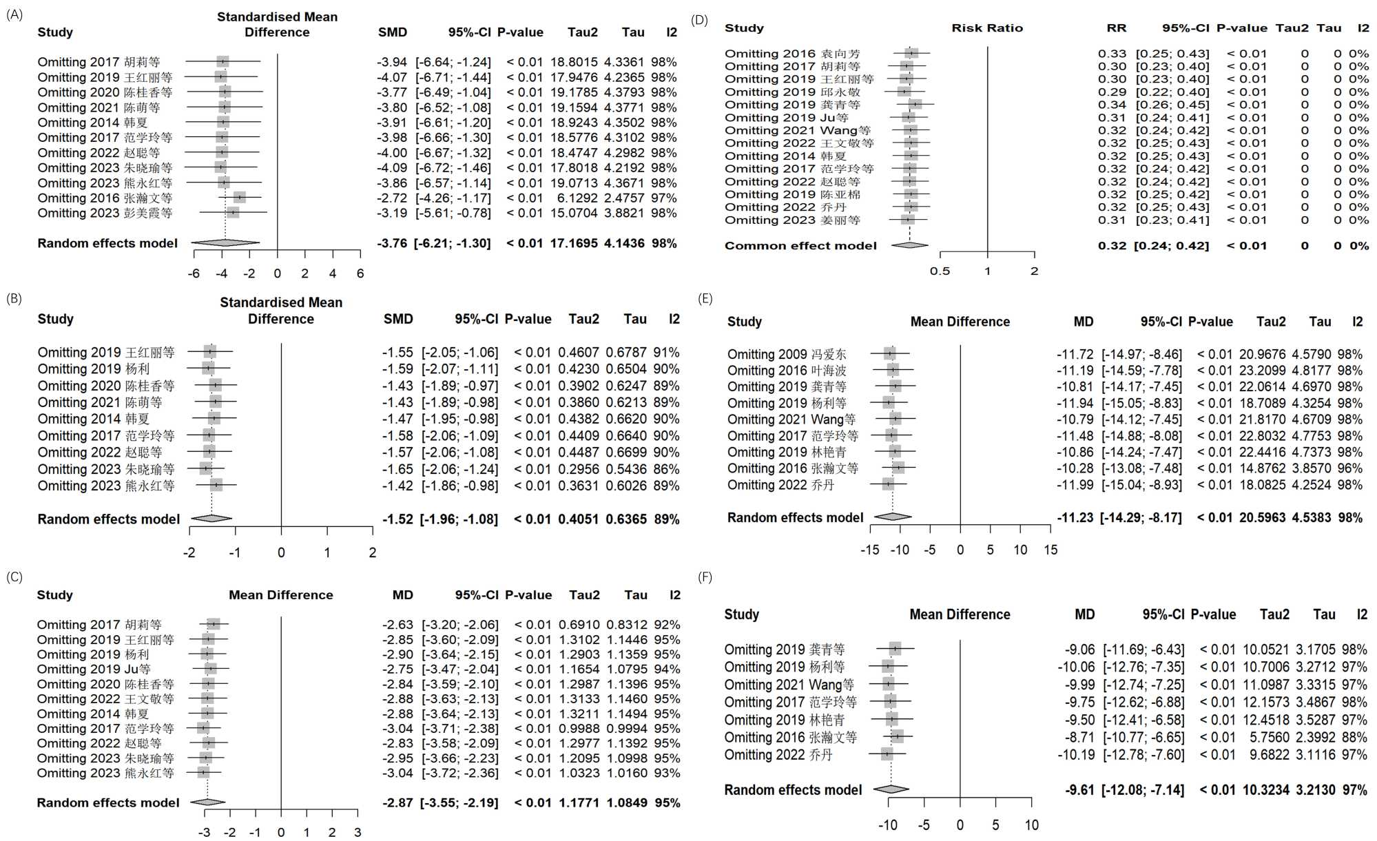 11项研究[23] [24] [27]-[29] [32]-[34] [36]-[38]报道了肝胆胰外科疾病患者的住院时间,共涉及1326例患者。与常规护理措施相比,纳入的护理干预措施(包括围手术期护理、快速康复外科护理、运动–营养管理模式护理、循证护理、临床护理路径护理、整体护理)对肝胆胰外科疾病患者住院时间干预效果差异有统计学意义。合并检验显示异质性较大(I2 = 95.0, P < 0.001),经逐一剔除文献进行敏感性分析,异质性变化不大,故采用随机效应模型[MD = −2.872, 95% CI (−3.555, −2.190), P < 0.001],见图2。