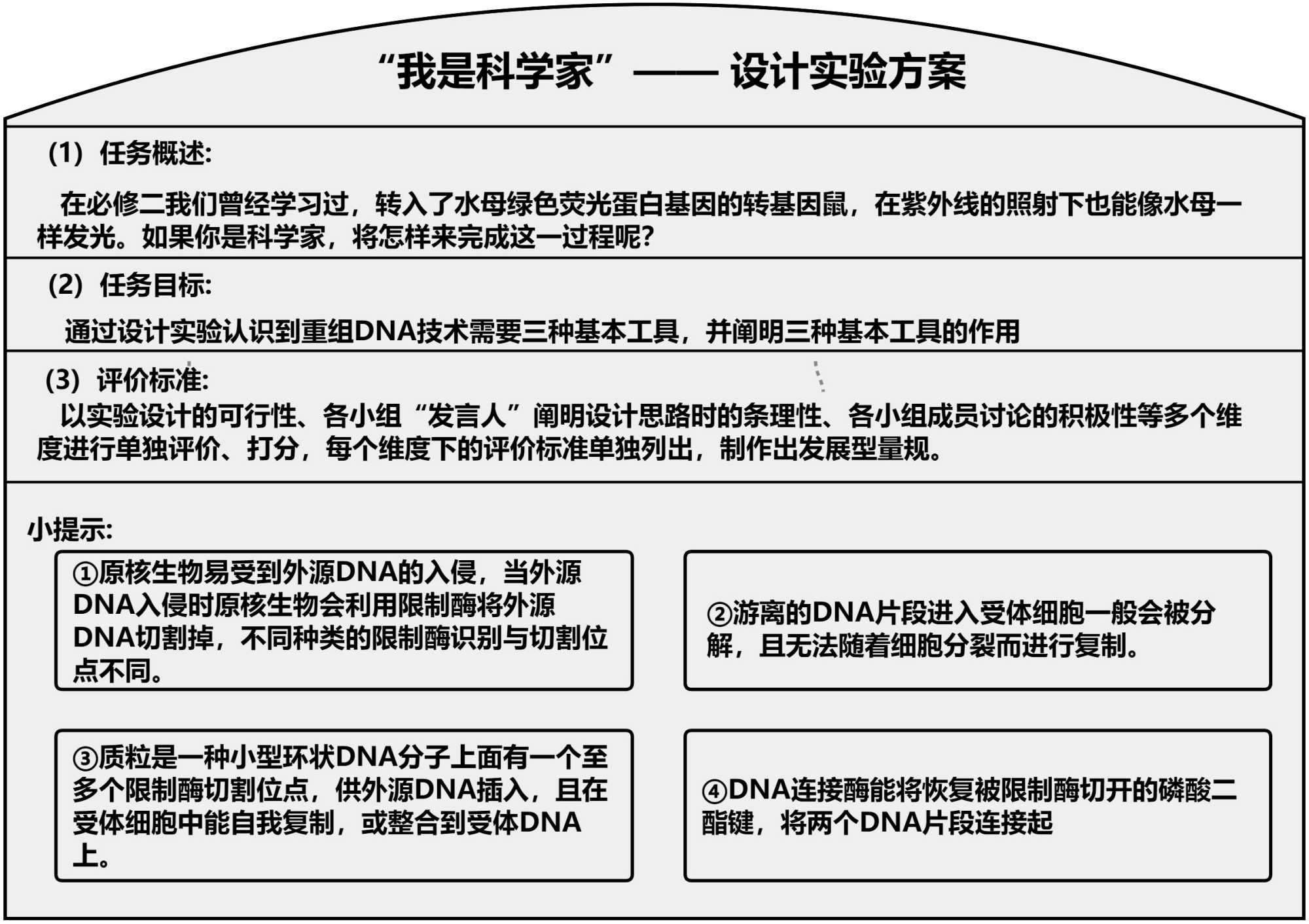 (4) 创设真实情境,围绕如何构建转基因小鼠,完成表现性任务“我是科学家”,各小组分享本组的实验方案(W, E1)。