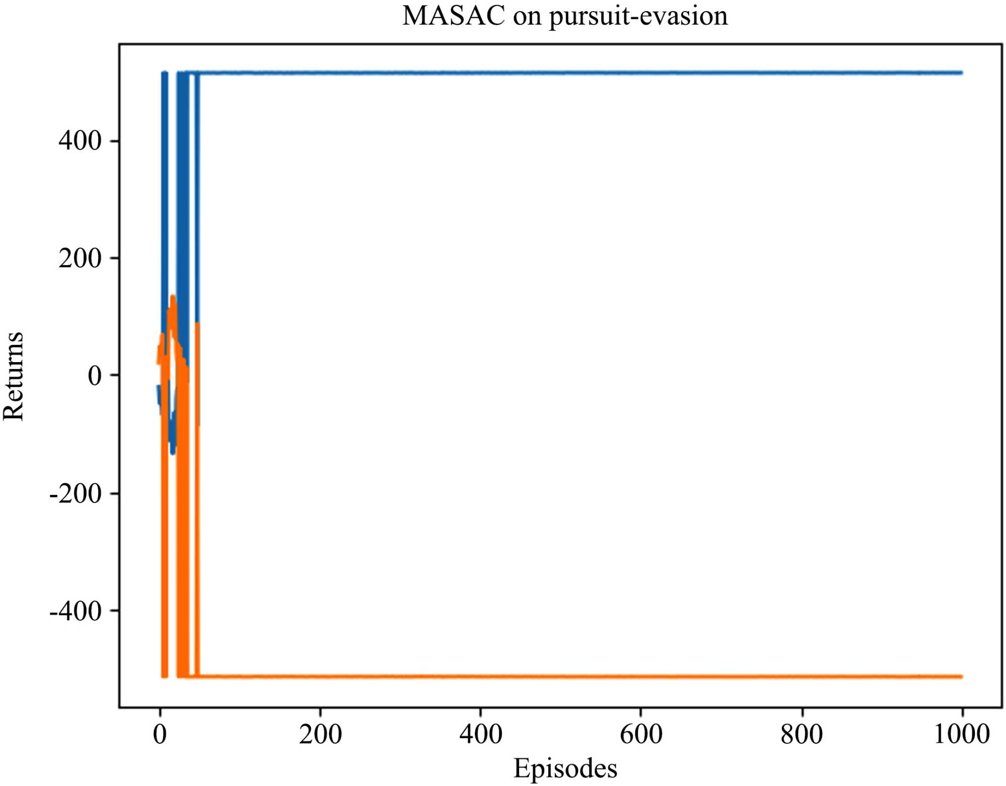 当追逐者捕捉到逃避者或时间步长达到500步时,一个回合结束,当经验池数量达到2000时开始训练,训练的初始条件如表3所示。