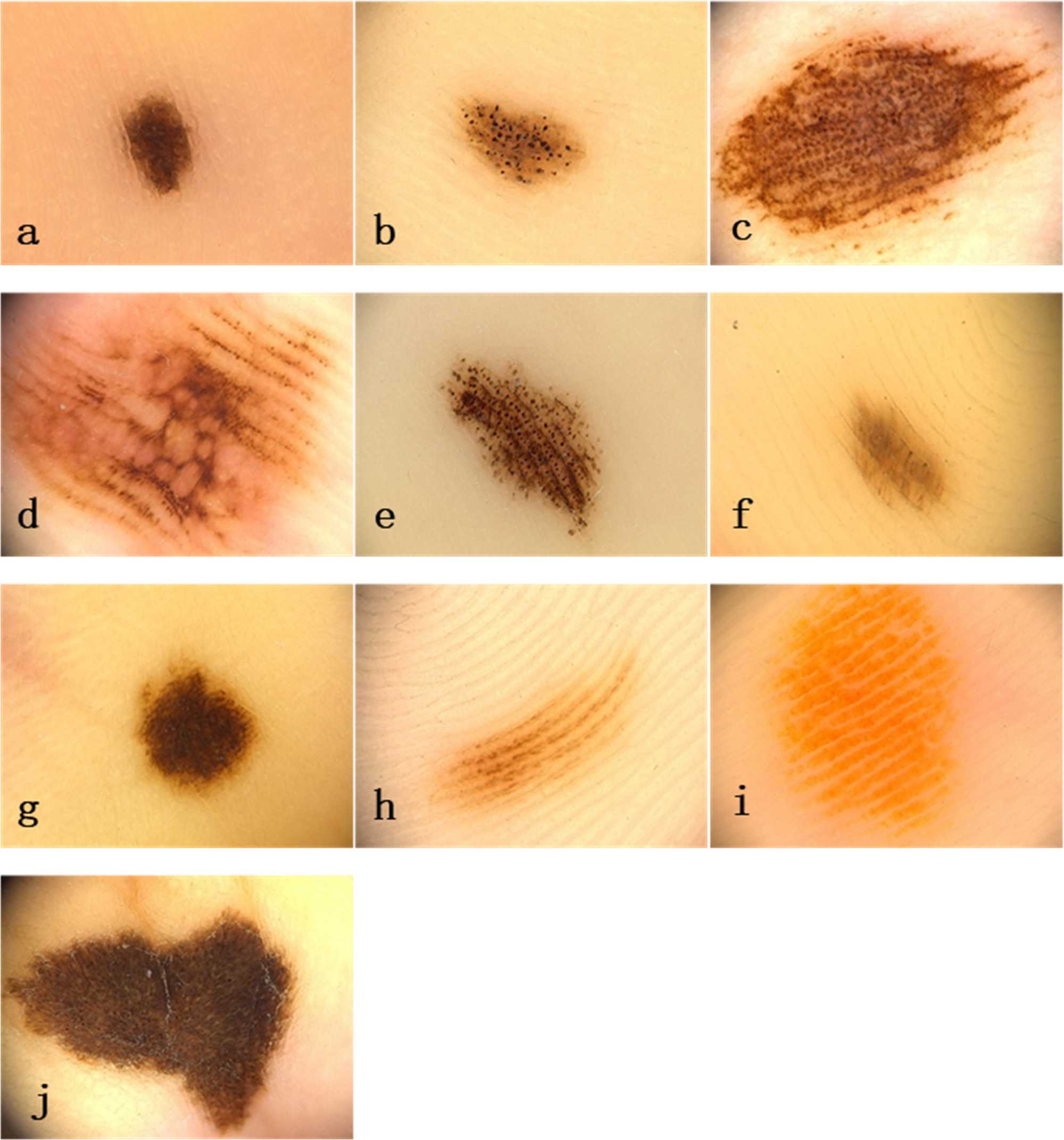 a:网格样模式;b:豌豆荚模式;c:色素过度模式;d:球状模式;e:皮嵴平行模式;f:皮沟平行模式;g:均质模式;h:过渡模式;i:非典型模式;j:纤维素样模式。