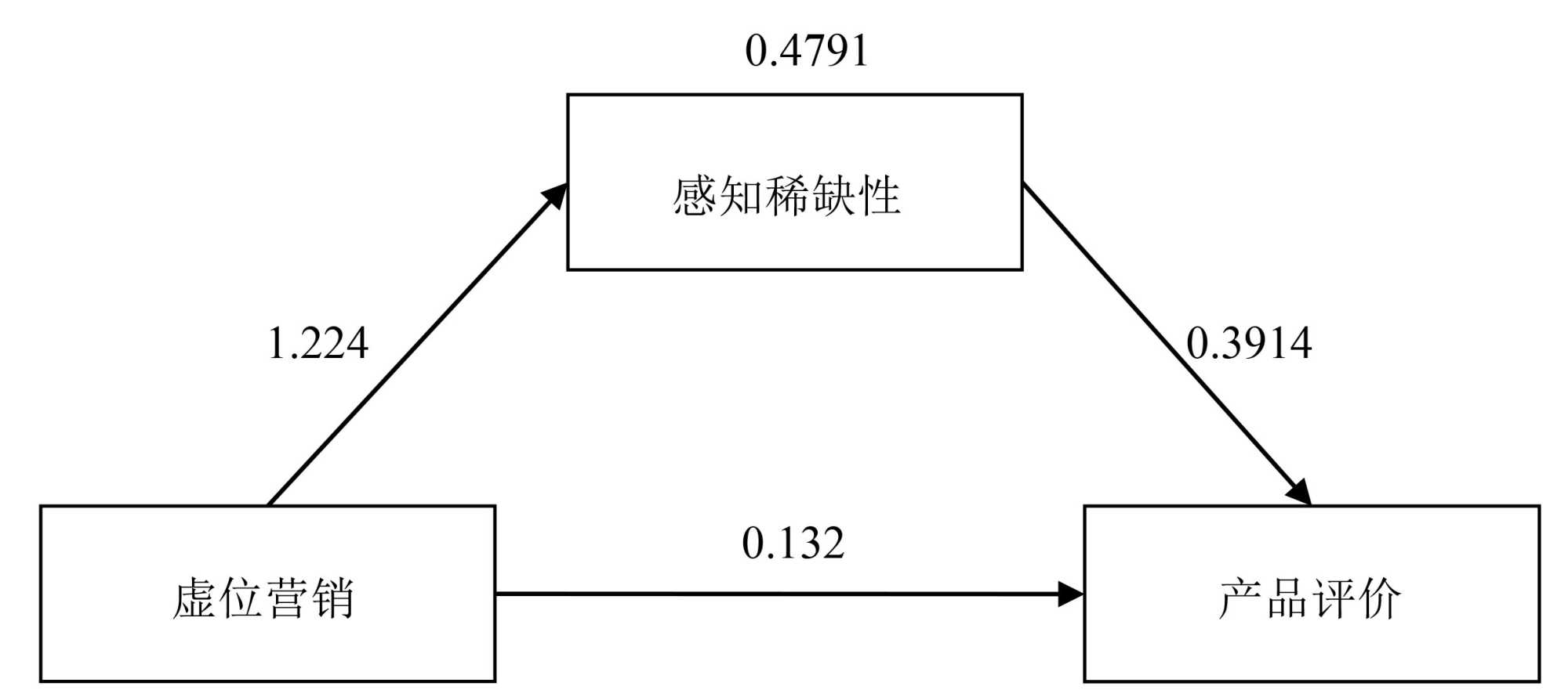 采用Bootstrap分析对感知稀缺性是否在虚位营销对产品评价的影响中起中介作用进行检验,引入哑变量处理虚位营销这个二分类变量,并对虚位营销方式和感知稀缺性变量进行去中心化处理,利用PROCESS模型进行中介效应分析,虚位营销对感知稀缺性的直接影响的置信区间为(0.7271, 1.7209)不包含0,且显著性为0.0000;感知稀缺性对产品评价的直接影响的置信区间为(0.2650, 0.5178)不包含0,且显著性为0.000;虚位营销对产品评价的直接影响置信区间为(−0.2536, 0.5177)包含0,且显著性为0.4993;而感知稀缺性在虚位营销对产品评价影响起间接作用时的置信区间为(0.2305, 0.7975)不包含0,作用路径如图4所示。综上所述,感知稀缺性在虚位营销对产品评价的影响过程中起完全中介作用,假设H6得到验证。