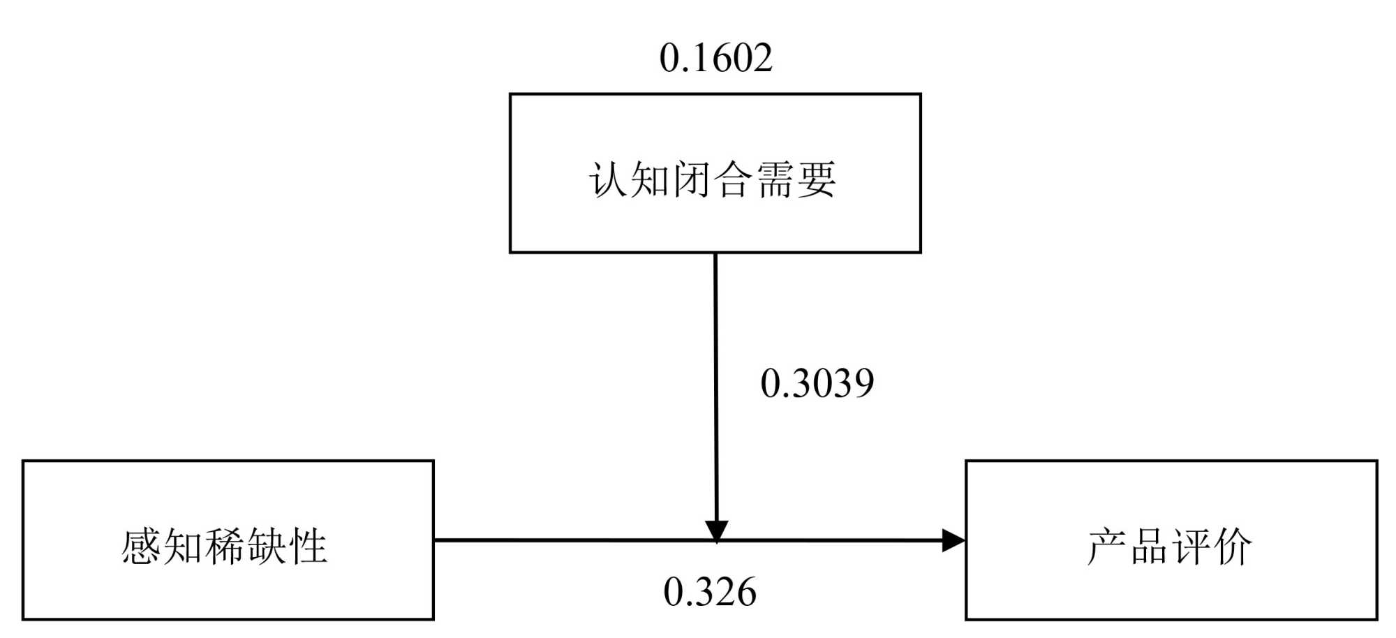 感知稀缺性对产品评价的直接影响的置信区间为(0.1713, 0.4806)不包含0,且显著性为0.0001;认知闭合需要对产品评价的直接影响的置信区间为(−0.0483, 0.6560)包含0,且显著性为0.0901;感知稀缺性和认知闭合需要二等交互项对产品评价影响置信区间为(−0.0709, 0.3912)包含0,且显著性为0.1725,作用路径如图5所示。综上所述,认知闭合需要在感知稀缺性对产品评价的影响过程中不起调节作用,因此假设H7未得到验证。