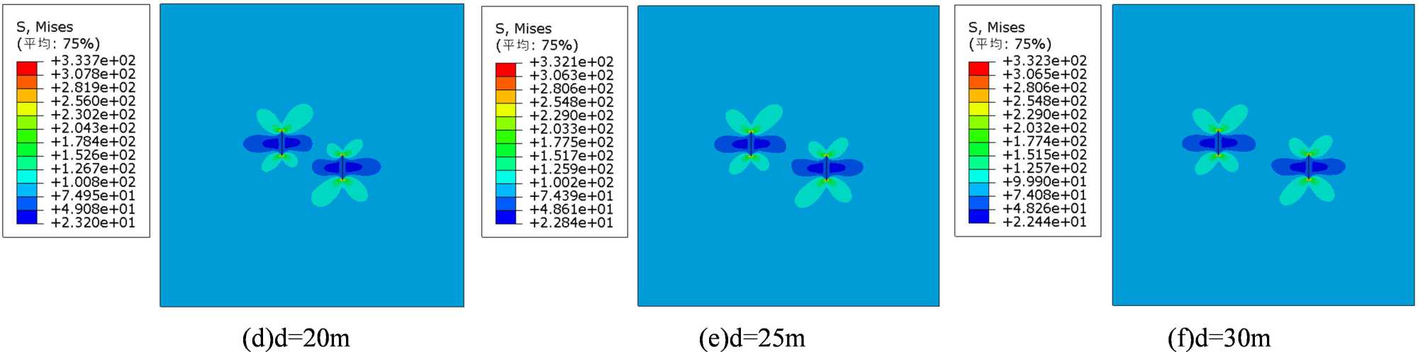图11. 不同间距d的垂直同轴双裂缝应力分布云图