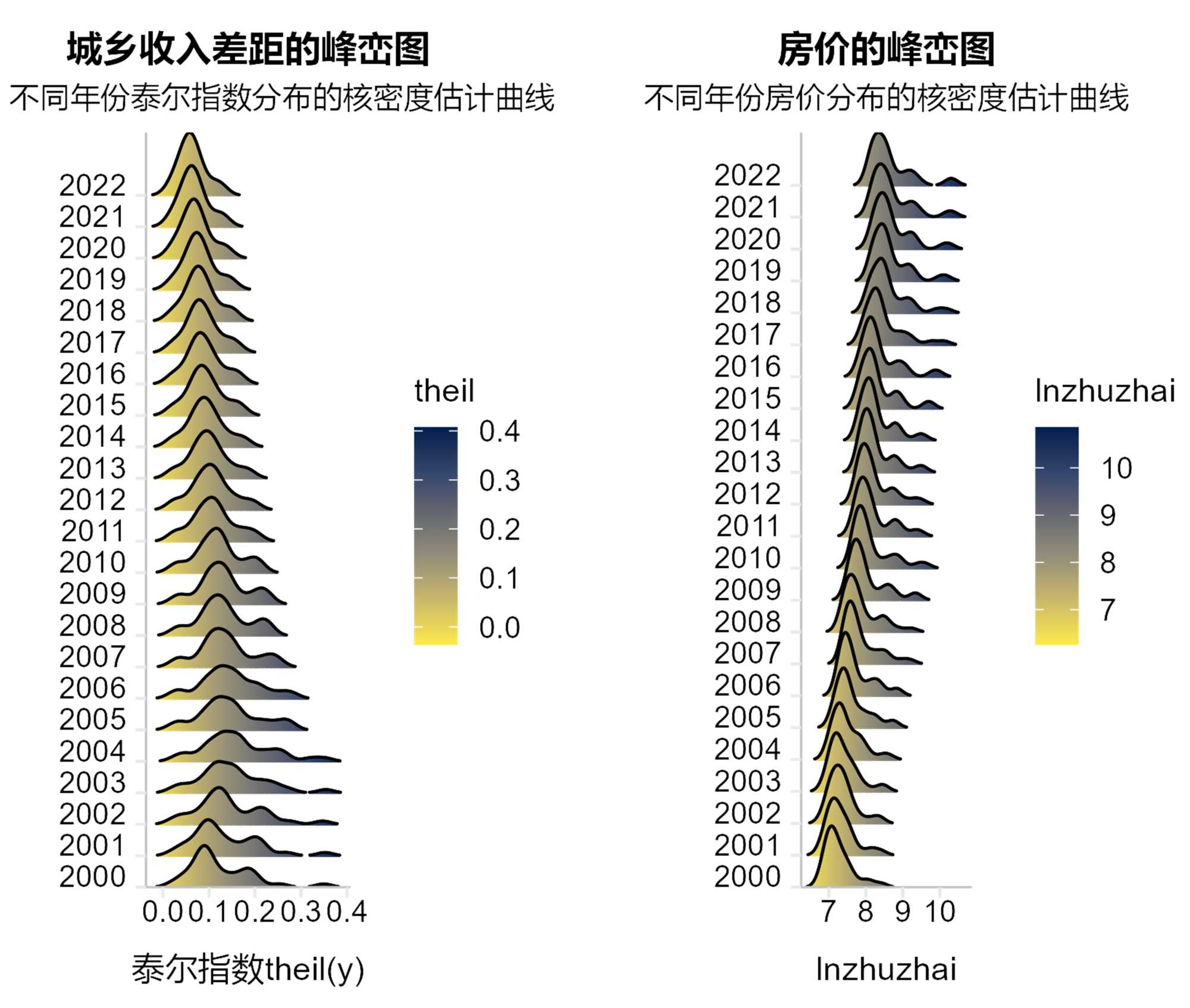 房价是关系国计民生的重要经济变量。我国房价从2000年的2112元/平方米,一路攀升到2023年的10,437元/平方米1。尽管国家不断对房地产市场的发展进行宏观调控,改善了房价持续高涨的现象。尤其是疫情过后,房价明显有了回落,但仍然有很多人“望房兴叹”。过高的房价很容易造成城乡居民在财产性收入、投资能力等多方面的差距,导致城乡居民收入差距的加重,影响到社会的公平公正。因此,研究房价变动对城乡收入差距的影响对维护社会稳定和谐、促进经济高质量发展等都具有重要意义。