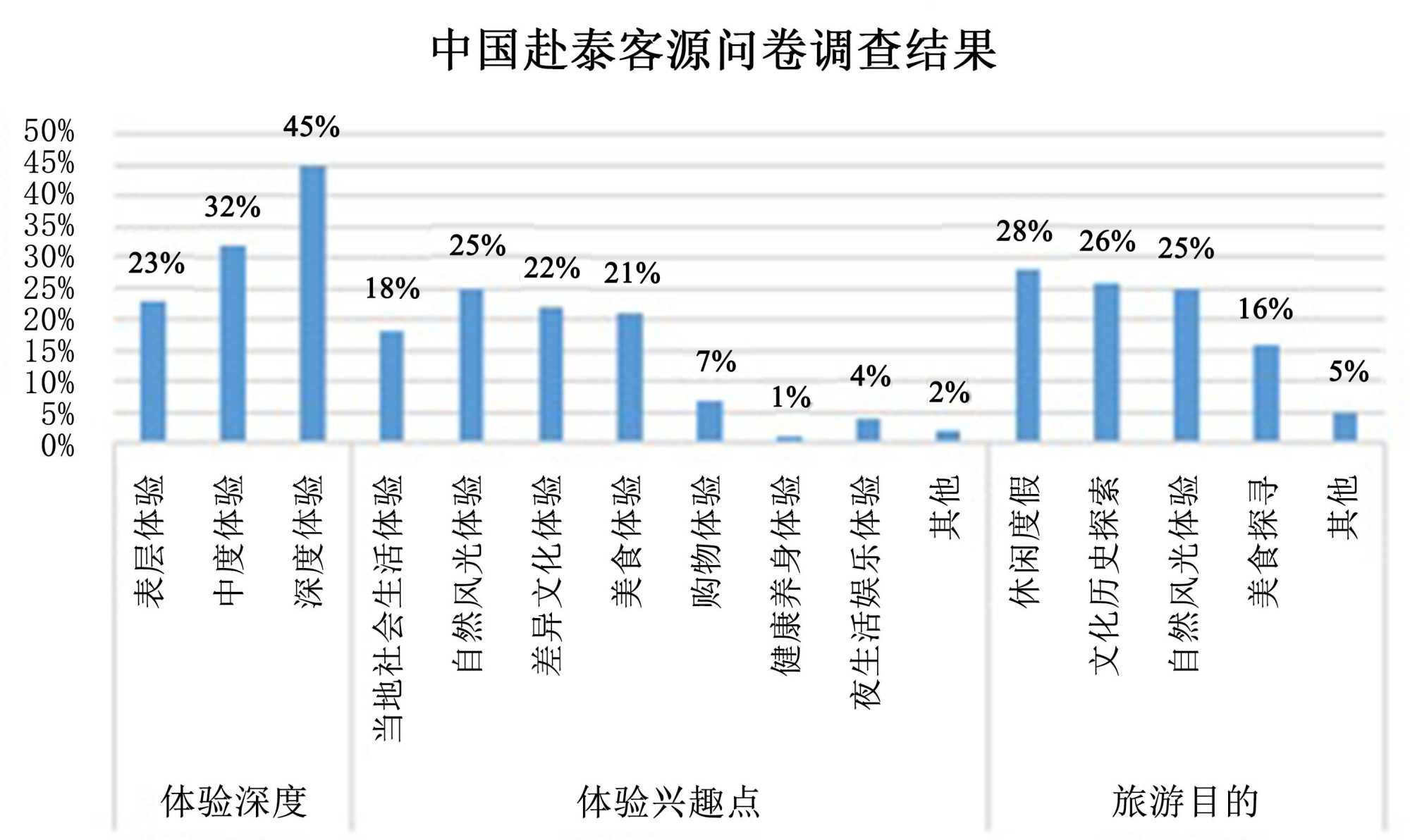 通过数据整理,调查结果见图1所示。从图中可以看到,被调查者在深度体验方面倾向于深度体验与中度体验,占比分别达到45%、32%,可见游客比之观光为主的表层体验,更希望得到近距离、全面参与融入的中、深层体验;在体验兴趣方面,更倾向于自然风光、差异文化、美食与当地社会生活体验,占比分别达到25%、22%、21%和18%,可见游客在兴趣偏好方面涵盖自然和人文多个维度,同时对自然风光和差异文化的关注程度相对较高;在旅游目的方面主要集中于休闲度假、文化历史探索、自然风光体验与美食探寻,占比分别达到28%、26%、25%和16%,由此可见,赴泰游客期待在旅行中放松身心的同时,对历史文化和自然风光有较强兴趣。由此可见,赴泰旅游产品的开发可结合这些特点向文化、美食、自然风光等多维度深度体验发展,以更好满足游客需求。