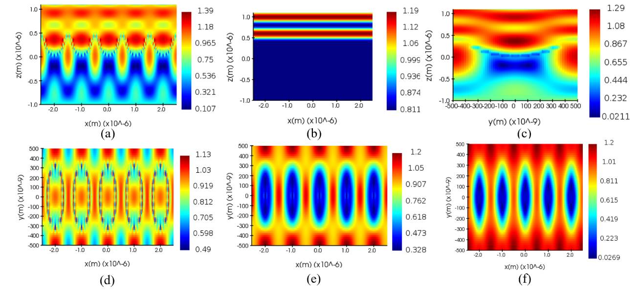 Figure 10. (a) Experimental group 2 x-z plane; (b) The x-z plane simulated electric field distribution in the control group; (c) y-z plane simulated electric field distribution; (d) (e) (f) The x-y plane simulated electric field distribution at z = 200 nm, z = 0 nm, and z = −200 nm, respectively