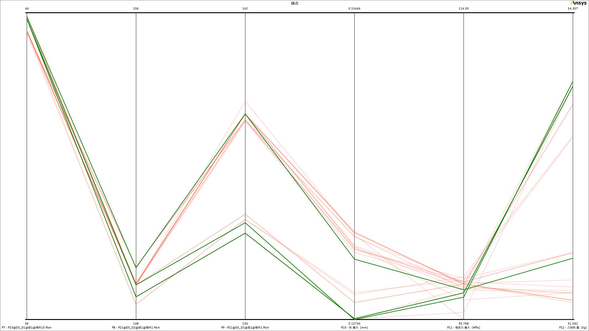 优化结果:通过140组设计点对目标参数的计算,系统得到的3组最优候选点如图10和表7所示。