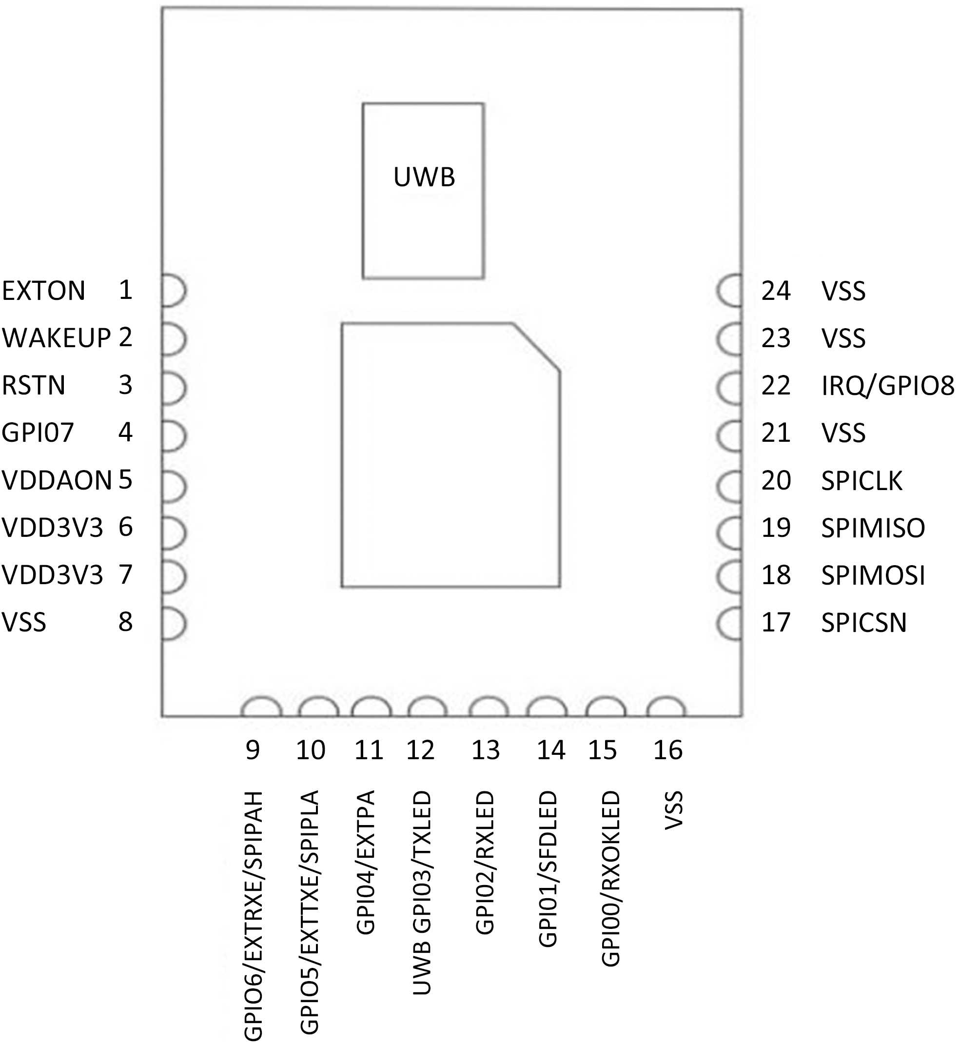 浮标芯片由DecaWave公司研发,符合IEEE802.15.4-2011超宽带标准,最小误差10 cm。技术参数:封装:QFN 49脚,单电源电压:2.8 V至3.6 V,数据传输速率:110 Kbit/s、850 Kbit/s和6.8 Mbit/s,工作频率:从3.5GHz至6.5 GHz分为6个频段发射频率:−14 dBm/−10 dBm,支持数据包:1023字节,调制方式:BPM (二相调制)和BPSK (二进制相位调制),工作温度:−40℃至85℃ (工业级),DW1000需外接晶振38.4 MHz,支持SPI通讯,具体使用时采用DW1000的二次封装模块,模块简介如图2:
