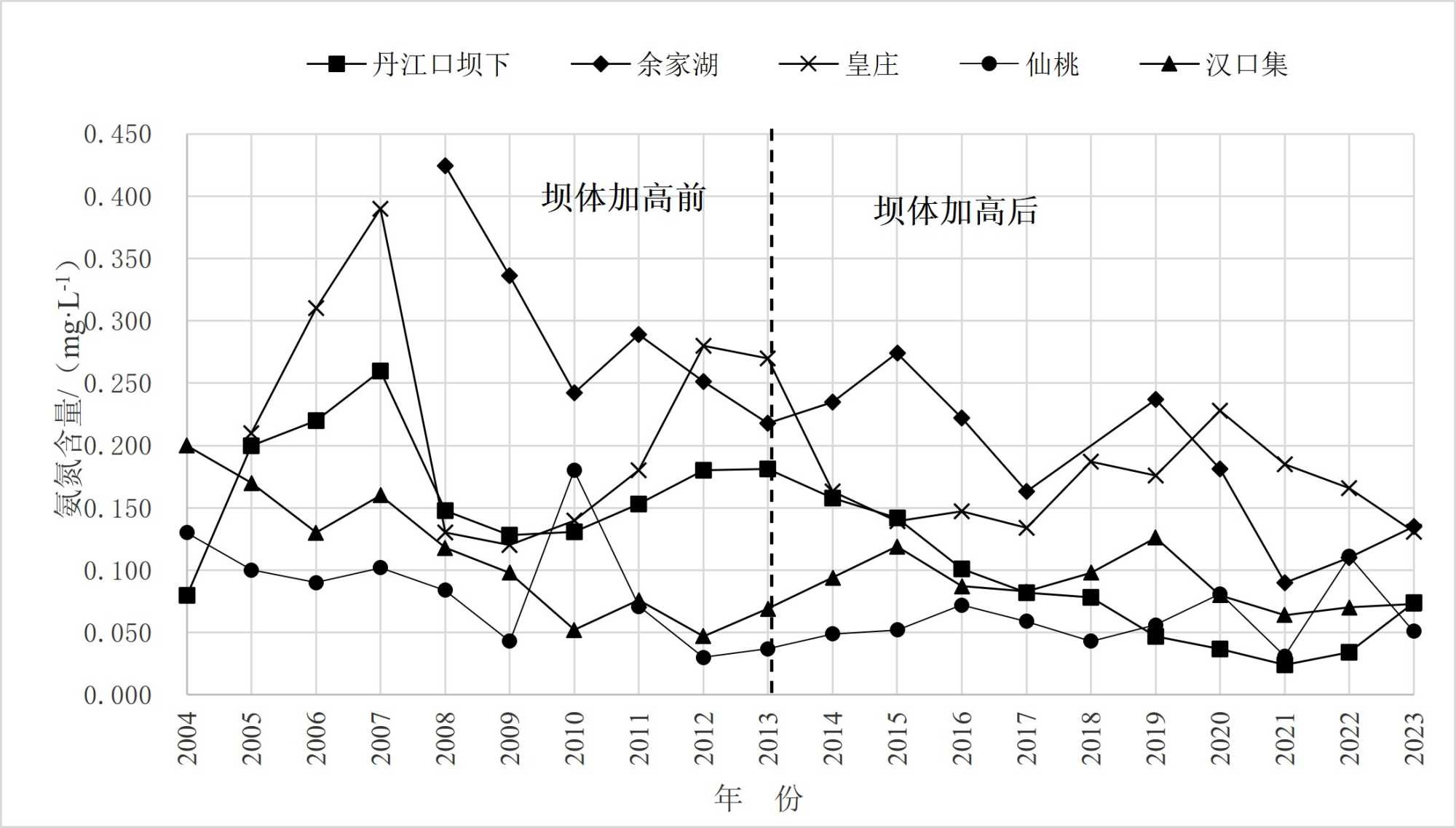 图3. 坝体加高前后汉江中下游干流氨氮年际变化趋势