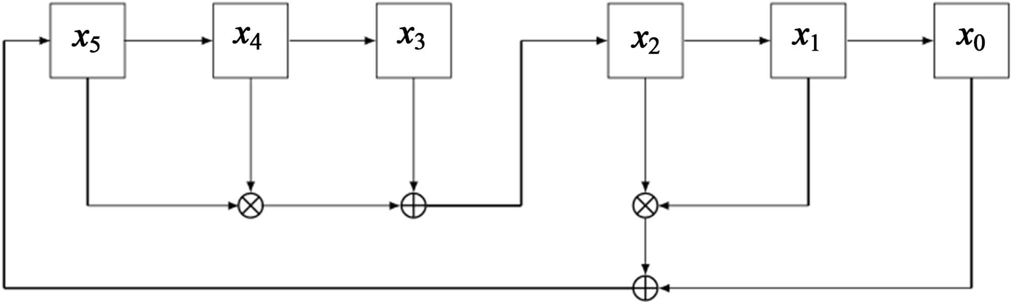 设定义在二元域上的6级互馈联结如图4所示,其中右侧的NFSR的反馈函数为