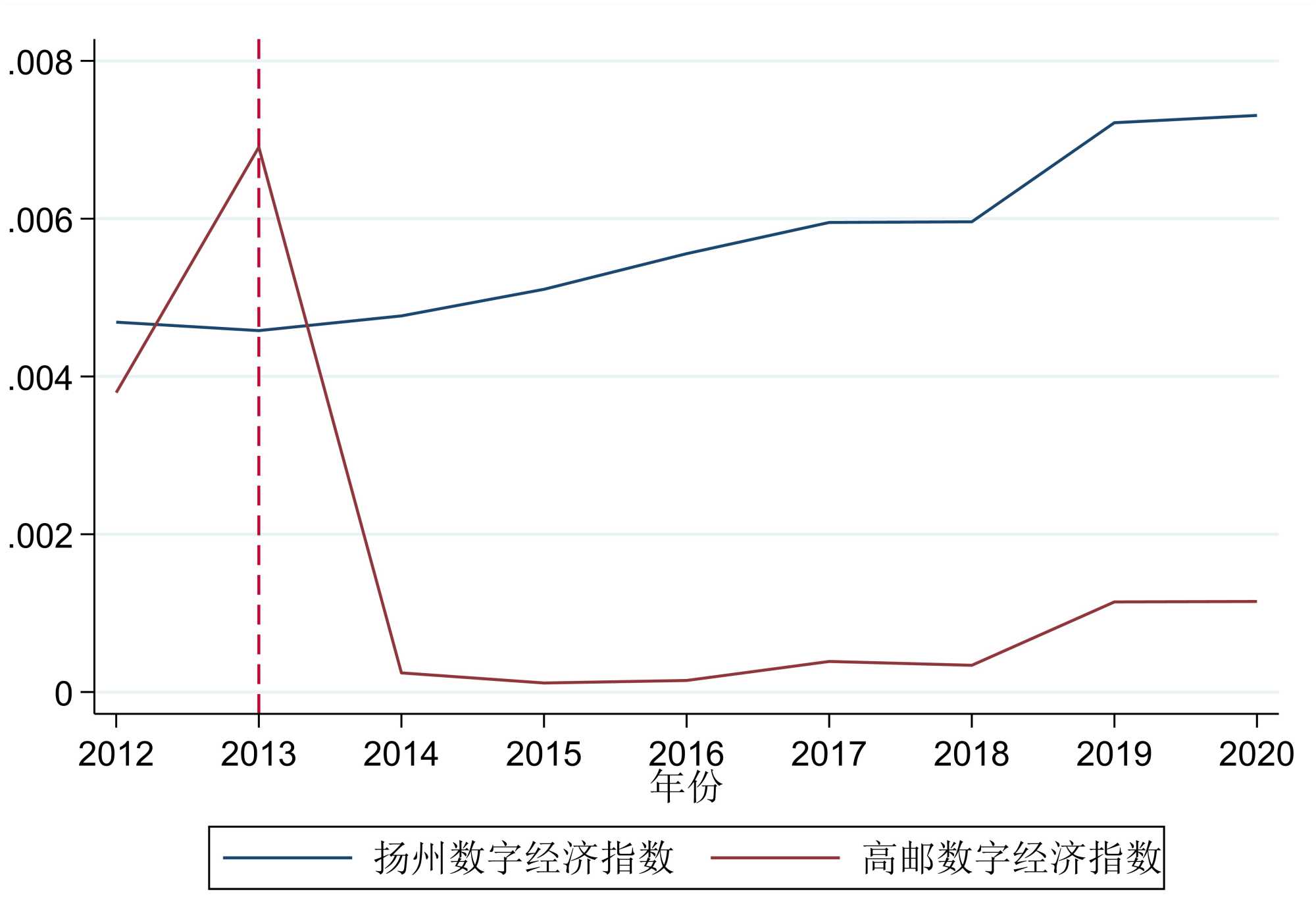 以信息传输、软件和信息技术服务业的全社会用电量代表当地的数字产业发展水平,由图2可知,高邮市的数字产业发展和扬州市的发展趋势大致相同,都呈现增长的势态。但不同于图1中基础设施建设的相近趋势,扬州市信息传输、软件和信息技术服务业的全社会用电量的增长幅度远大于高邮市,高邮市的数字经济产业发展仍有所欠缺。