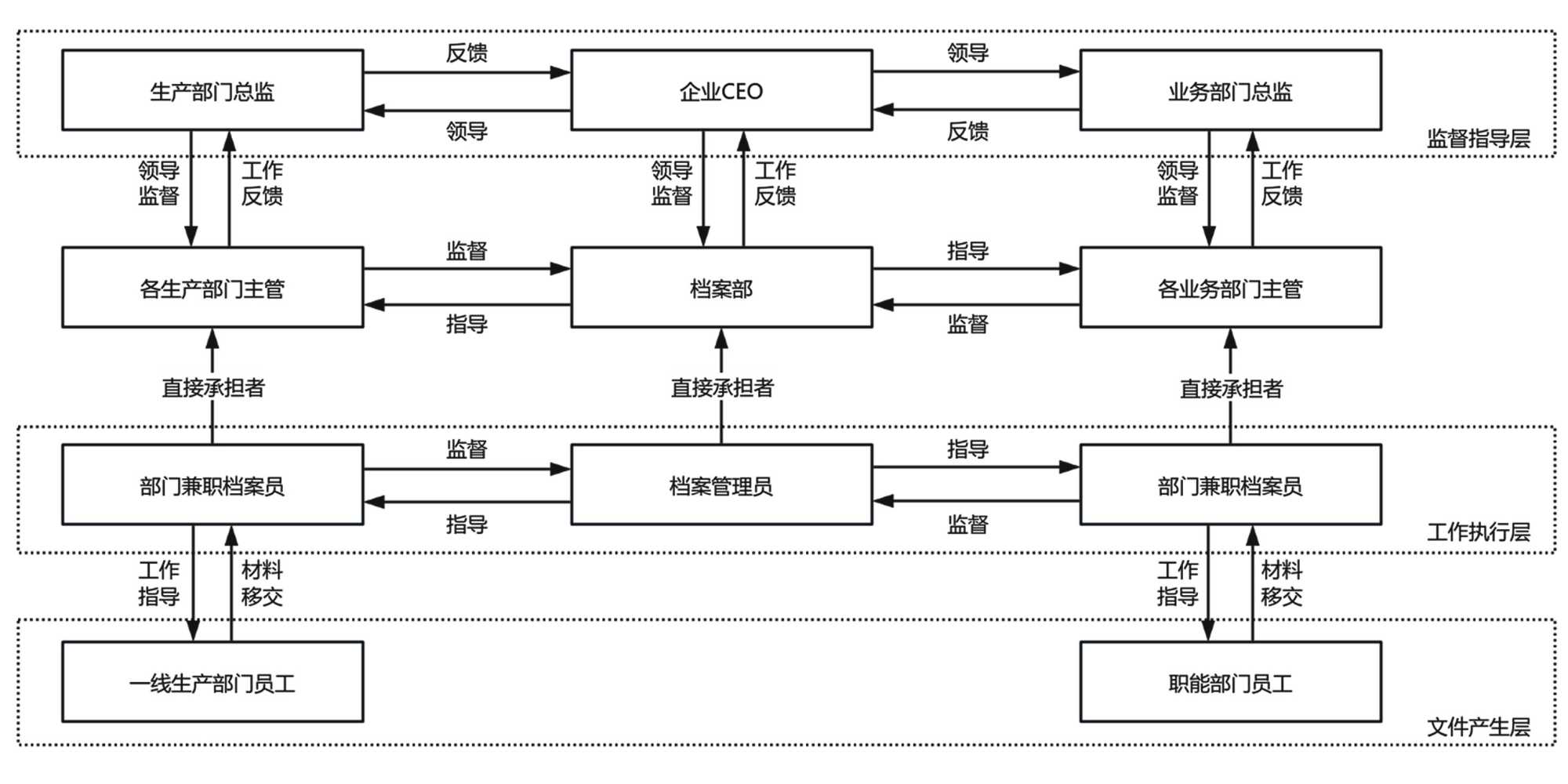 企业应当鼓励档案管理人员及管理层领导打破传统档案管理思维束缚,积极探索适合电子档案管理的新模式和新方法,不再仅仅将电子档案管理质量的优化局限于档案工作人员身上。实际上,电子档案管理的质量控制应涵盖业务部门员工、其他部门员工、档案管理人员以及各级各部门领导等多类群体。为此,笔者结合企业的实际情况,将电子档案的管理划分为电子档案产生层、工作执行层和监督指导层三个层次,见图1。在这一体系中,档案产生层位于最下层,由一线生产部门员工和业务部门员工组成,他们负责接收工作执行层的档案工作指导,并向其转交需要保存的档案材料。监督指导层则处于最上层,既对工作执行层的档案管理工作进行监督指导,又接收其工作情况的反馈。而工作执行层,由各业务部门兼职档案员和档案员构成,作为企业档案工作的直接承担者,他们负责收集、整理档案材料,并在档案部门的指导下进行档案材料的移交,实现材料的入库保存。为了确保电子档案管理的质量,企业需推动员工档案管理思维的转变,从档案产生的源头对档案材料的质量标准加以控制。为此,企业应广泛开展电子档案知识的宣传普及与培训工作,使员工深刻理解归档日常业务档案材料的范围和内容要求。同时,在企业日常业务活动中,就应对电子档案的格式和命名进行规范和要求,确保电子档案在生成阶段的质量就符合电子档案管理工作的相关要求,从而架构起一个完善、有效的电子档案过程控制体系。