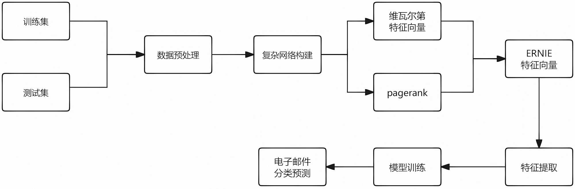 4) 模型训练和预测模块:该模块通过使用提取的特征进行训练和学习,将融合特征向量与ERNIE生成的语义特征向量共同作为输入,训练XGBoost模型,从而实现电子邮件分类。